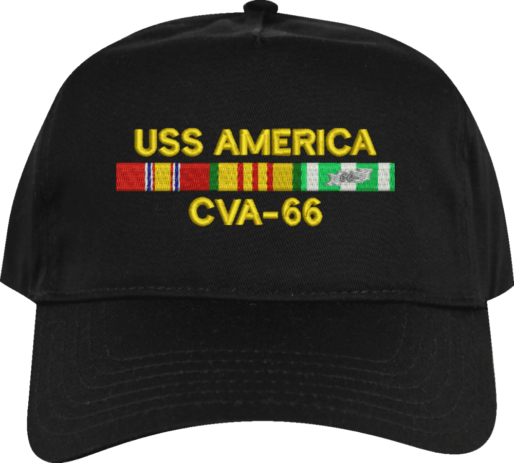 MilitaryBest is proud to offer this USS America CVA-66 with Vietnam Service Ribbons Embroidered Cap. This cap is available in a 5 panel high profile or 6 panel low profile styling. All our caps are made from top quality materials. This cap would make a wonderful addition to your collection or a great gift! All custom embroidery is done at our facility in Scottsboro, AL. *Caps ordered with embroidered back text requires an additional 1 to 2 days of production time. All personalized caps will be embroidered in ALL CAPITAL LETTERS. Caps personalized with back text are not returnable unless there is a material defect in the cap.A percentage of the sale of each MilitaryBest item is forwarded to the licensing departments of each respective branch of service in support of the MWR (Morale, Welfare, & Recreation) program. These payments are made by either ALL4U LLC or the wholesaler from where the item originated. Our team thanks you for your service and your support of these programs.