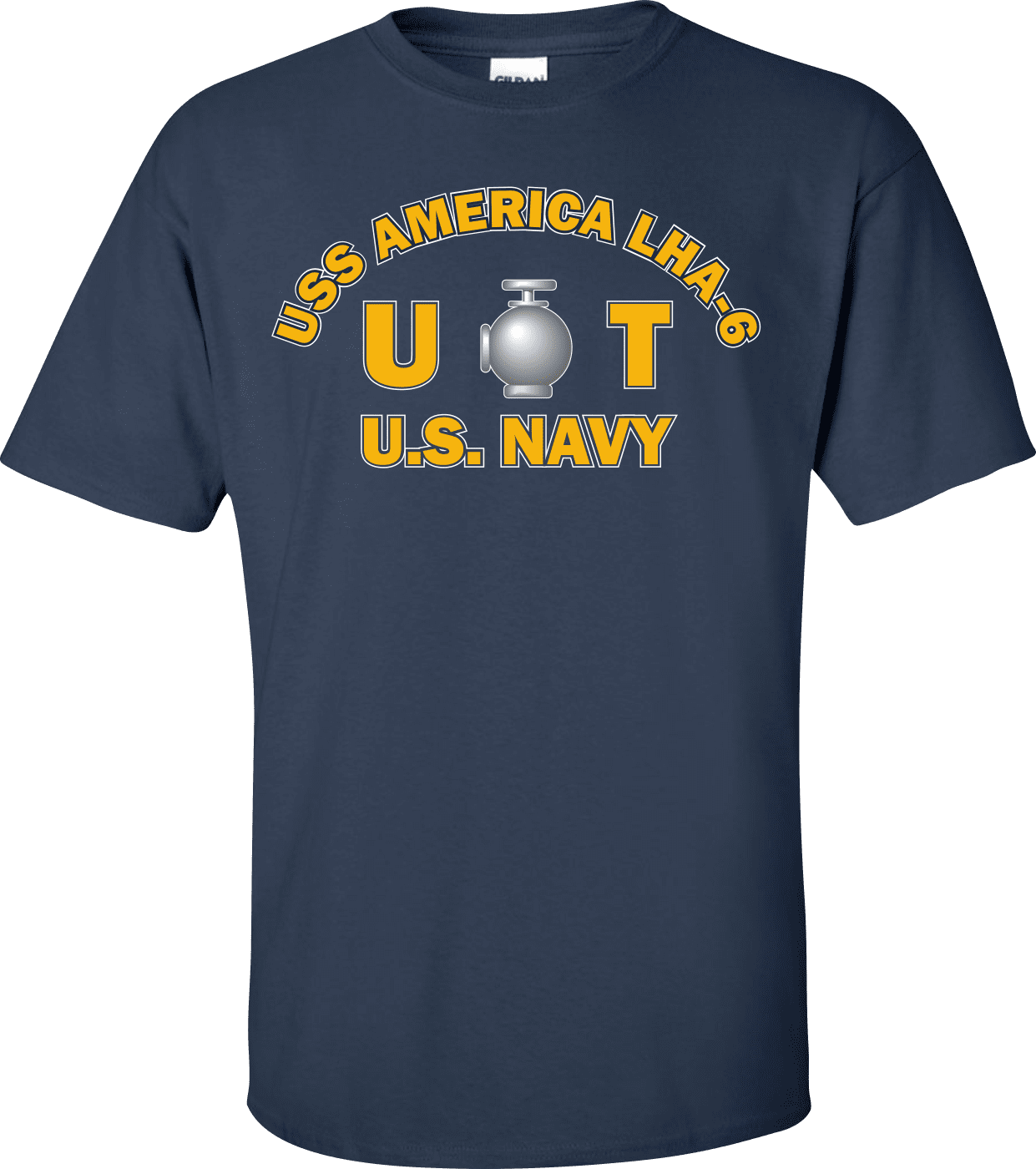 MilitaryBest is proud to offer this USS AMERICA LHA-6 Rate UT Utilitiesman T-Shirt. This shirt is available as a 100% cotton t-shirt or a 100% polyester men’s or women’s moisture wicking t-shirt. Each shirt is proudly printed in the USA.
