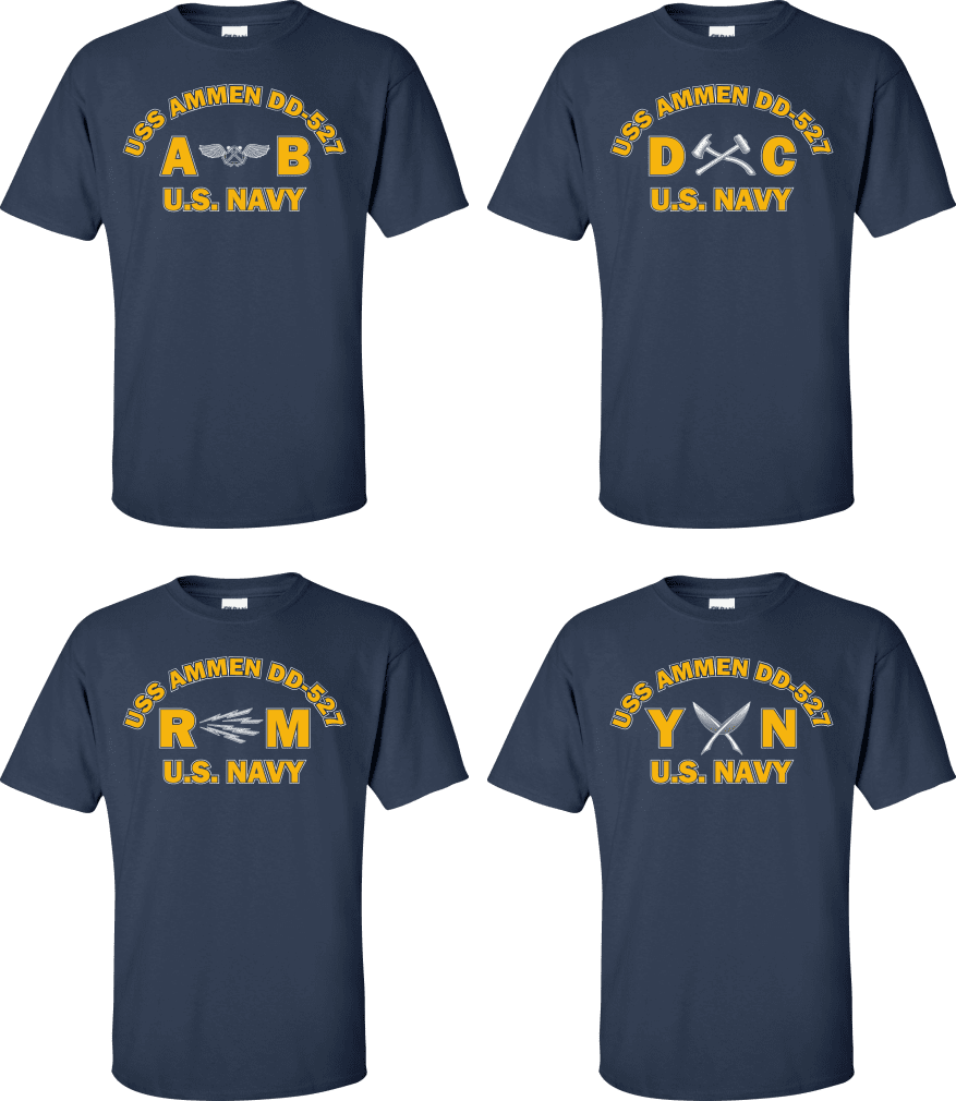Due to disruptions in supply chains, this design will be embroidered on a Champion, Gildan, Jerzees or comparable brand.Proudly display your ship and rate with our top quality USS AMMEN DD-527 Rates t-shirts, sweatshirts, and hoodies. These fine U.S. Navy apparel items will make you the envy of your veteran buddies, or will make a fine gift! Our USS AMMEN DD-527 shirts are proudly printed in the USA!