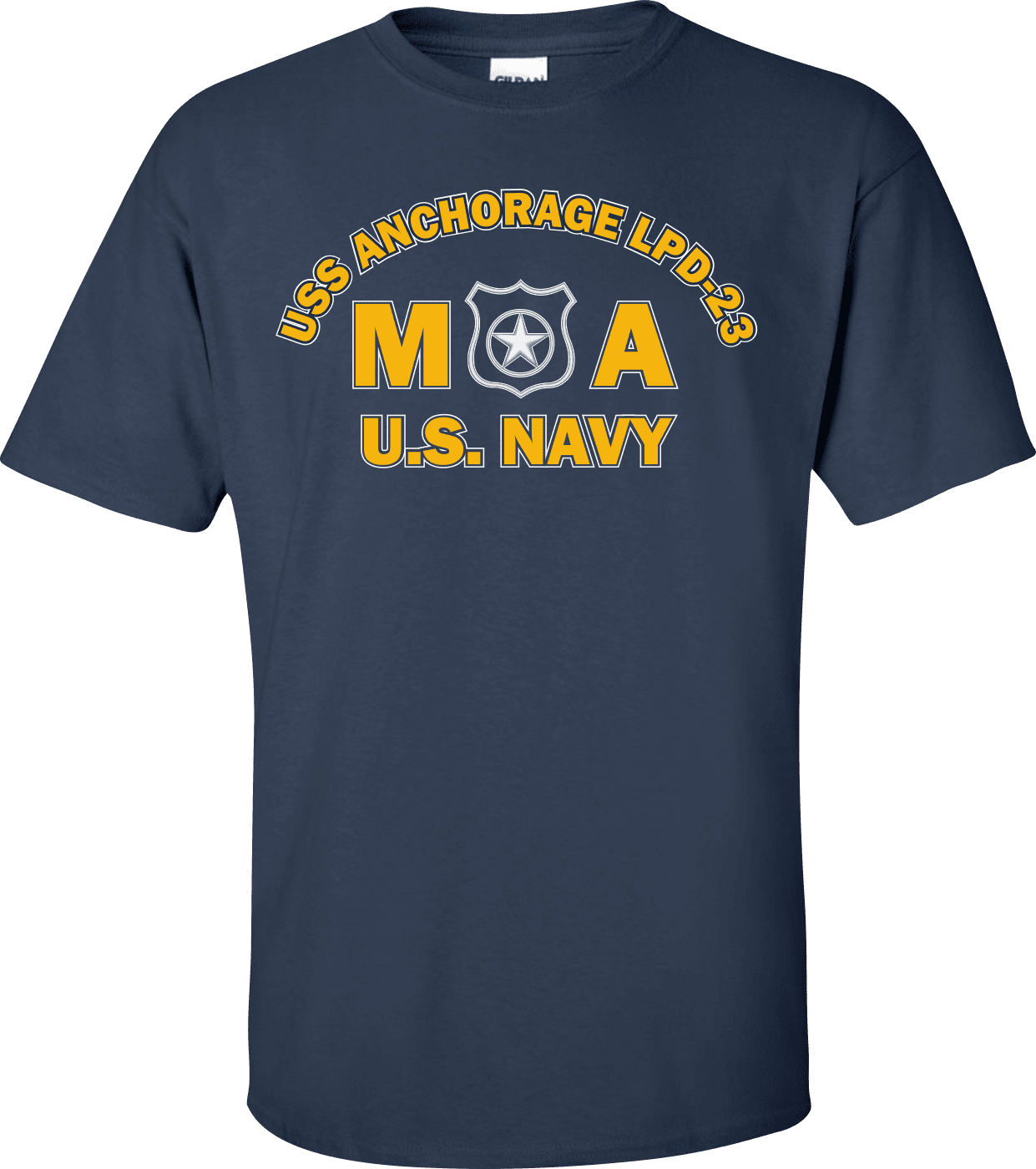MilitaryBest is proud to offer this USS ANCHORAGE LPD-23 Rate MA Master At Arms T-Shirt. This shirt is available as a 100% cotton t-shirt or a 100% polyester men’s or women’s moisture wicking t-shirt. Each shirt is proudly printed in the USA.