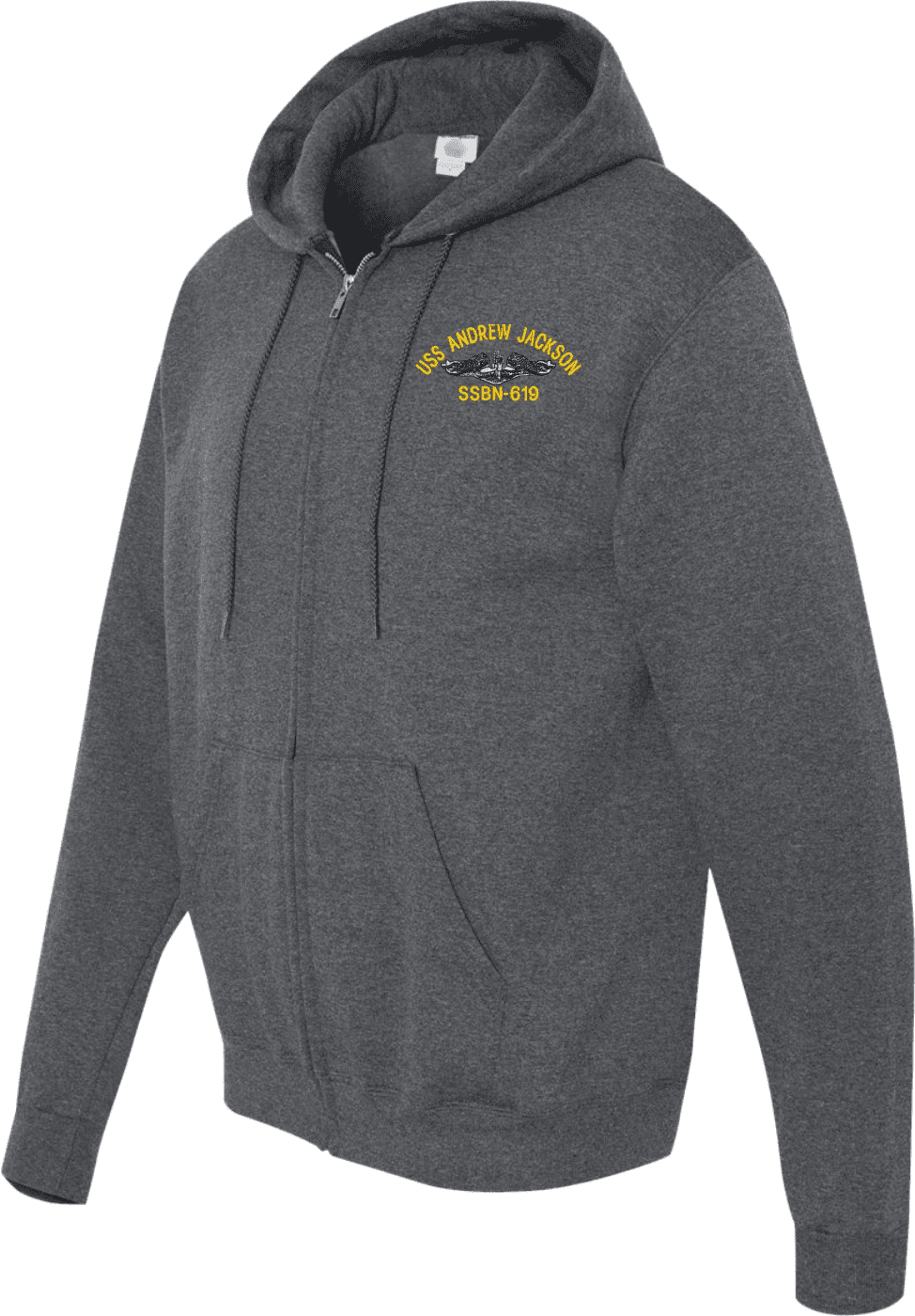 MilitaryBest has expanded its line of apparel with this custom embroidered USS Andrew Jackson SSBN-619 (BLUE) with Dolphins Embroidered Zippered Hoodie. Each Hoodie is direct embroidered onto a Champion brand 9.5 oz 50/50 Cotton Poly blend. This will make an excellent addition to your wardrobe, or a great gift. Your satisfaction is Guaranteed! These quality zippered hoodies are proudly embroidered at our facilities in Scottsboro, AL. Support the Army MWR program by purchasing only from Licensed Vendors.
