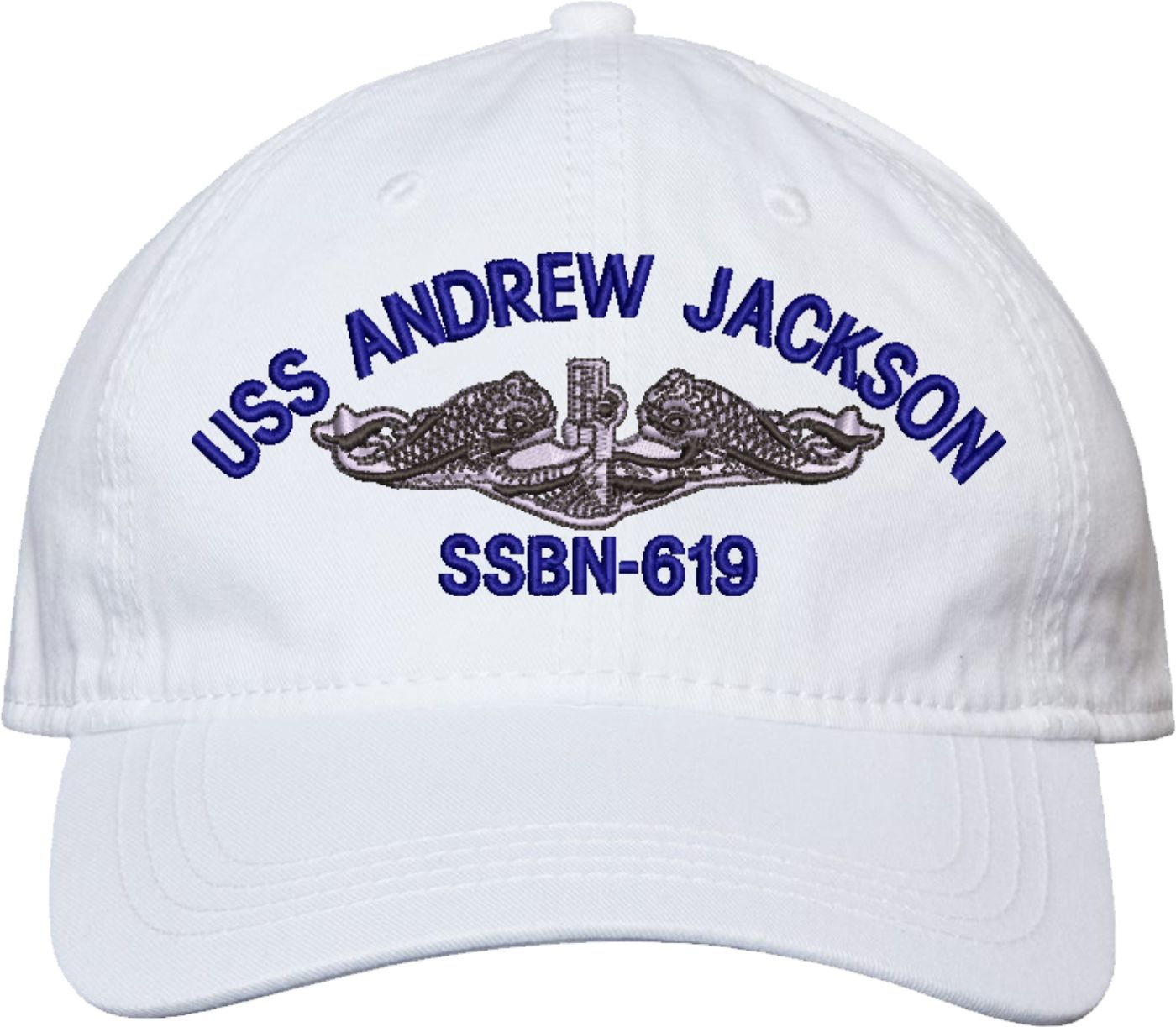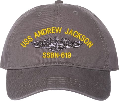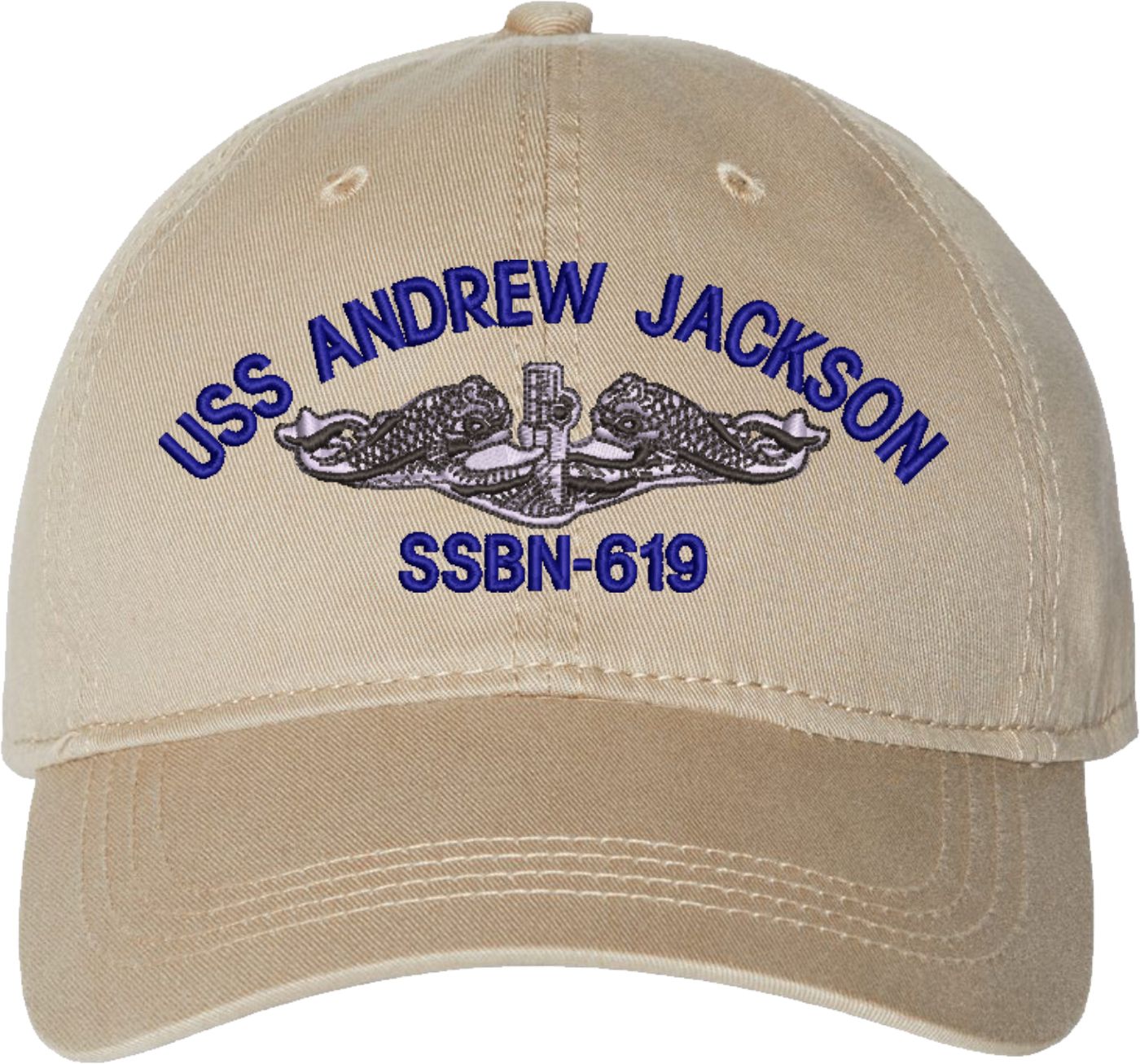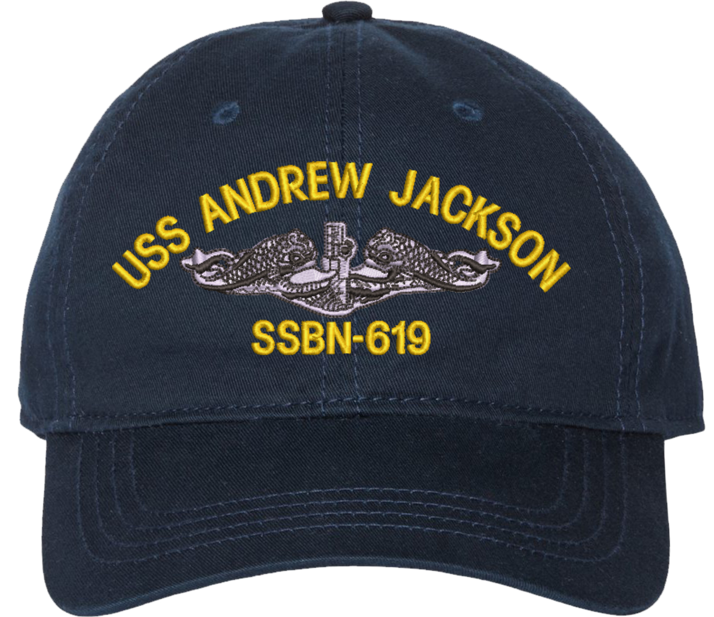 Show your Navy pride with this USS Andrew Jackson SSBN-619 with Dolphins Unstructured Dad Cap from MilitaryBest. Crafted from 100% washed chino twill cotton, this six-panel, low-profile cap offers a relaxed and comfortable fit. Featuring high-quality embroidery done in our Scottsboro, Alabama facility, this cap is designed with a pre-curved visor and an adjustable tri-glide buckle closure for a perfect fit. Whether for everyday wear or as a meaningful gift, this cap is a great way to honor your own or a loved one's service.For caps ordered with custom embroidered personalized text please allow an additional 3 to 5 days production time. All custom back text will be embroidered in ALL CAPITAL LETTERS. Caps with back text or eggs are non-returnable unless there is a material defect in the cap.
