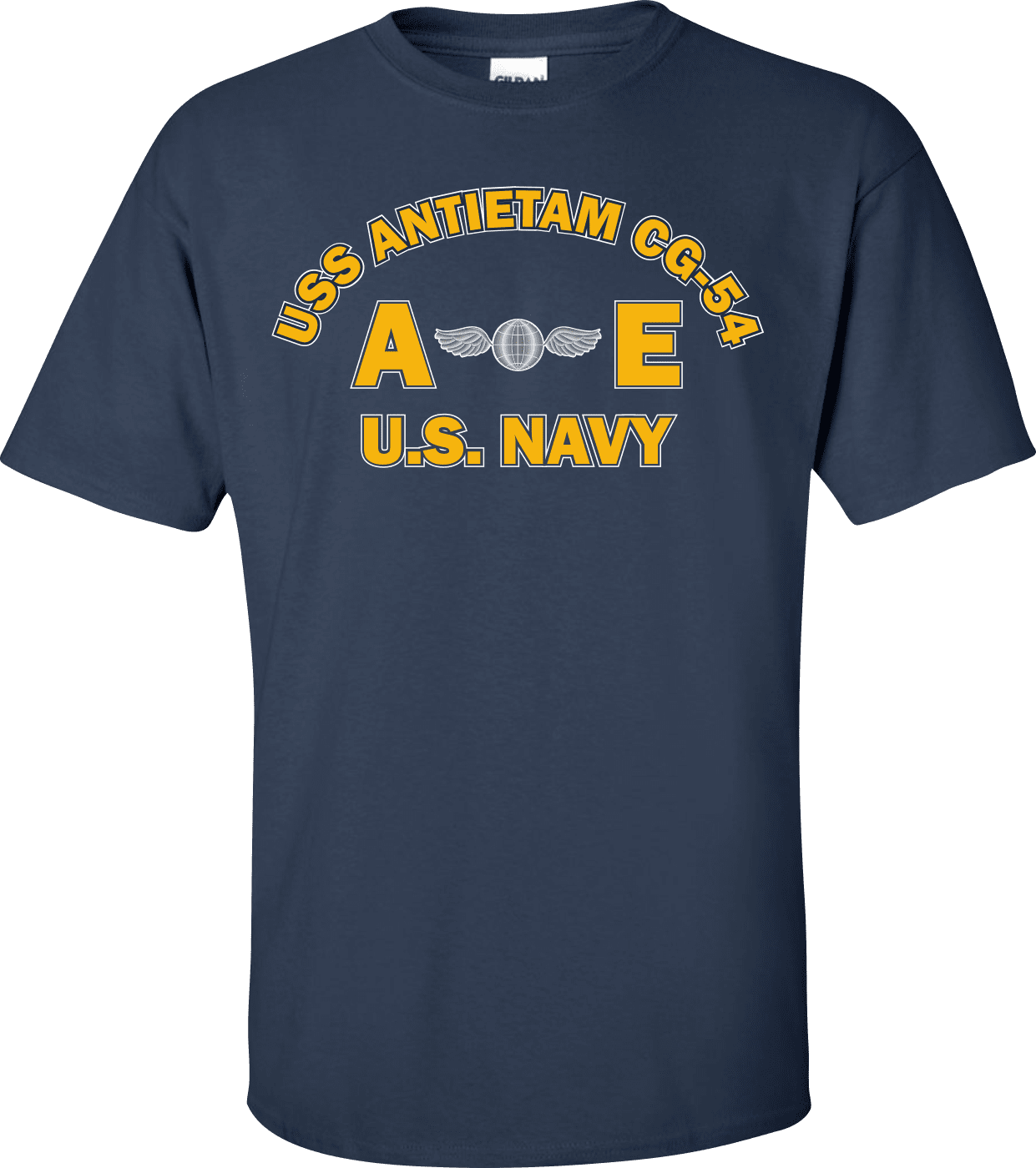 MilitaryBest is proud to offer this USS ANTIETAM CG-54 Rate AE Aviation Electricians Mate T-Shirt. This shirt is available as a 100% cotton t-shirt or a 100% polyester men’s or women’s moisture wicking t-shirt. Each shirt is proudly printed in the USA.