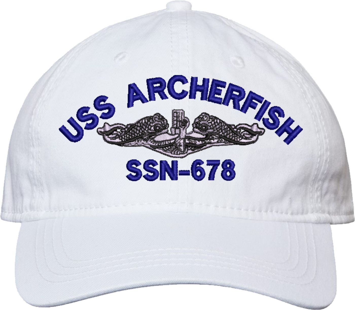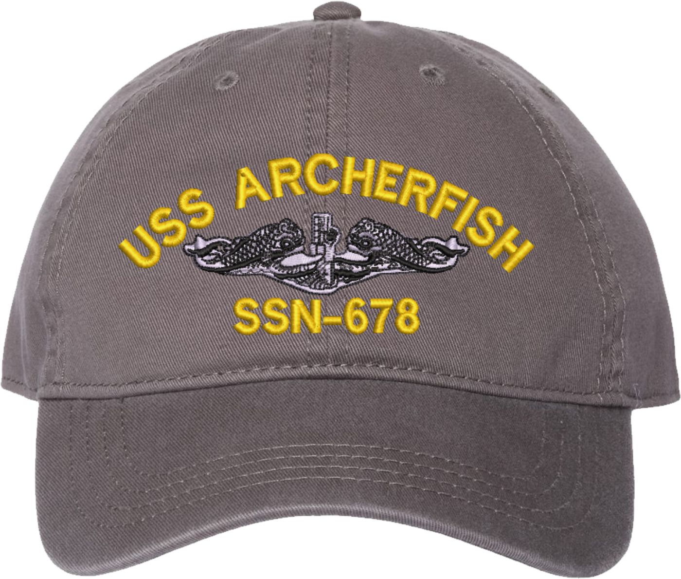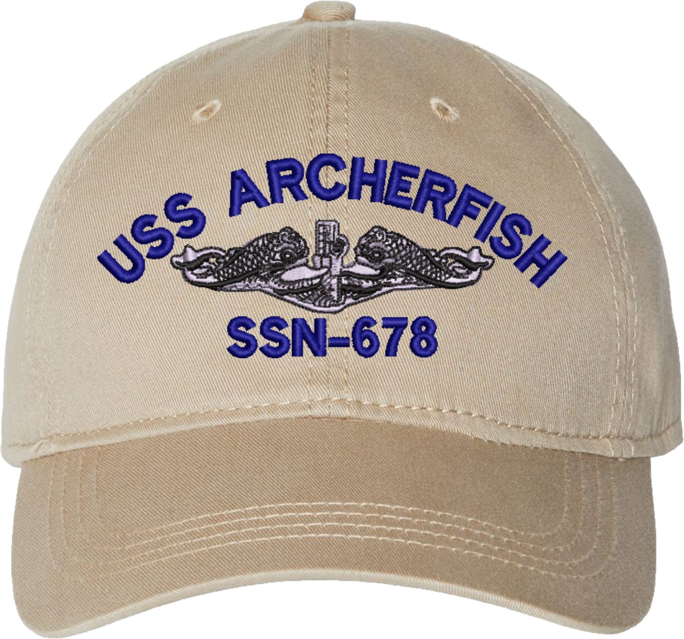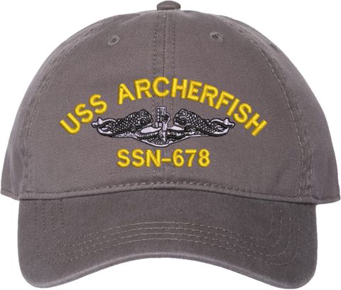 Show your Navy pride with this USS Archerfish SSN-678 with Dolphins Unstructured Dad Cap from MilitaryBest. Crafted from 100% washed chino twill cotton, this six-panel, low-profile cap offers a relaxed and comfortable fit. Featuring high-quality embroidery done in our Scottsboro, Alabama facility, this cap is designed with a pre-curved visor and an adjustable tri-glide buckle closure for a perfect fit. Whether for everyday wear or as a meaningful gift, this cap is a great way to honor your own or a loved one's service.For caps ordered with custom embroidered personalized text please allow an additional 3 to 5 days production time. All custom back text will be embroidered in ALL CAPITAL LETTERS. Caps with back text or eggs are non-returnable unless there is a material defect in the cap.