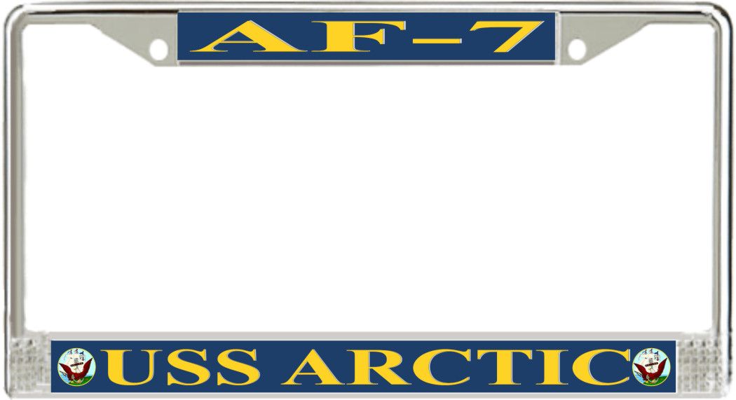 USS Arctic AF-7 License Plate FrameThis USS Arctic AF-7 License Plate Frame is proudly made in the USA at our facilities in Scottsboro, Alabama. Each of our MilitaryBest U.S. Navy Frames feature top and bottom Poly Coated Aluminum strips that are printed using sublimation which gives these quality automobile military frames a beautiful high gloss finish.