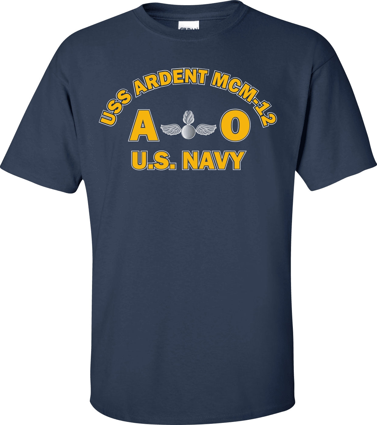 MilitaryBest is proud to offer this USS ARDENT MCM-12 Rate AO Aviation Ordnanceman T-Shirt. This shirt is available as a 100% cotton t-shirt or a 100% polyester men’s or women’s moisture wicking t-shirt. Each shirt is proudly printed in the USA.