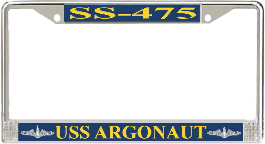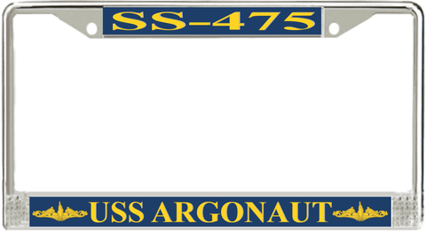 USS Argonaut SS-475 License Plate Frame This USS Argonaut SS-475 License Plate Frame is proudly made in the USA at our facilities in Scottsboro, Alabama. Each Frame features top and bottom sublimated design strips that are poly coated for a protective gloss finish. Please check your state and local regulations for compatibility of these frames for use on your vehicle.