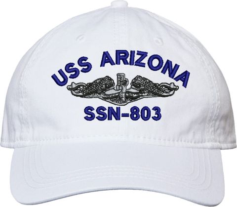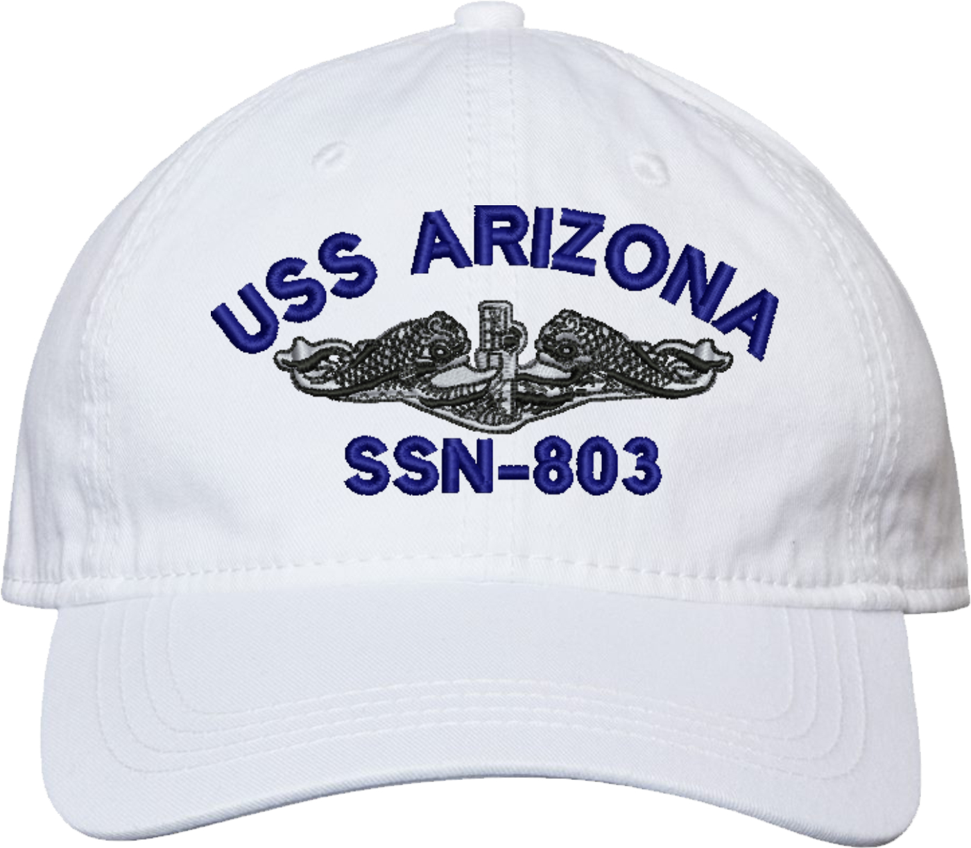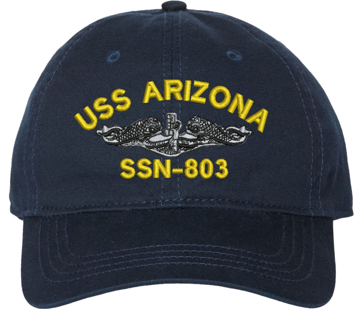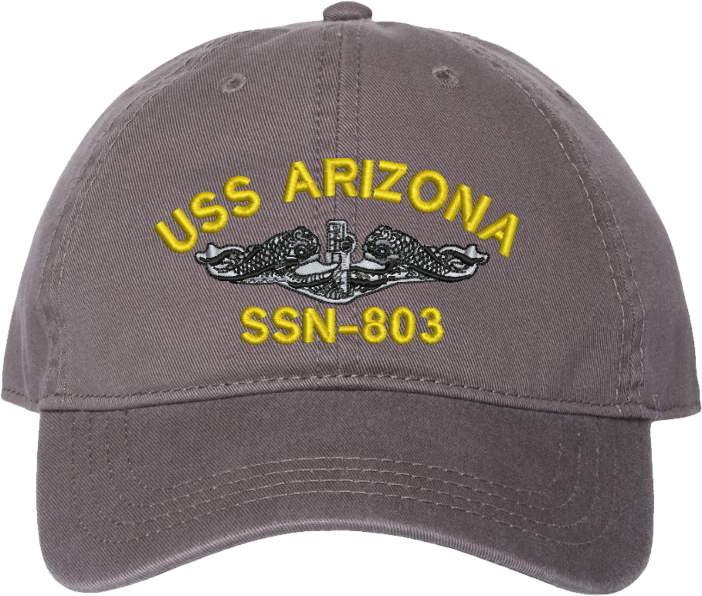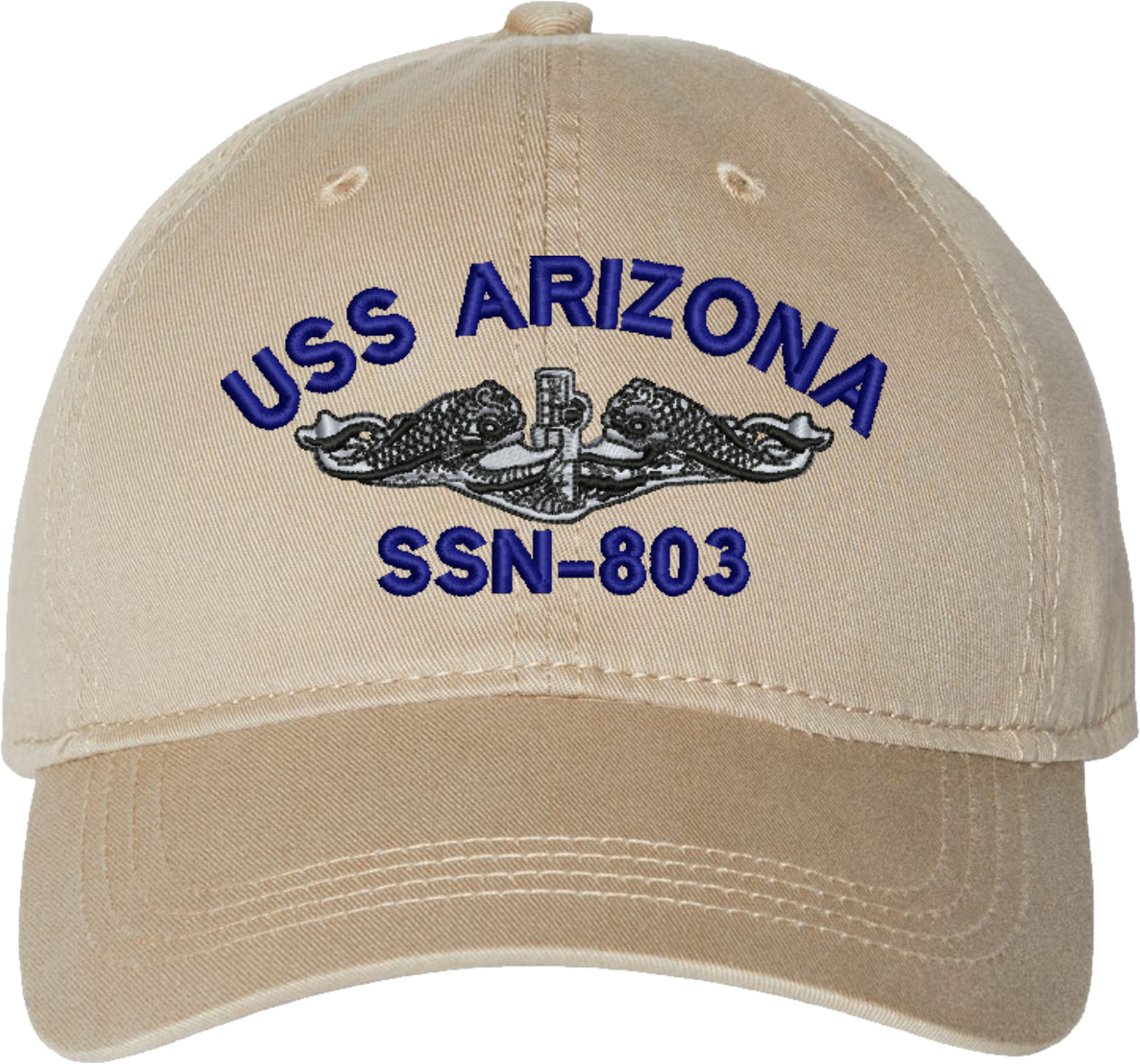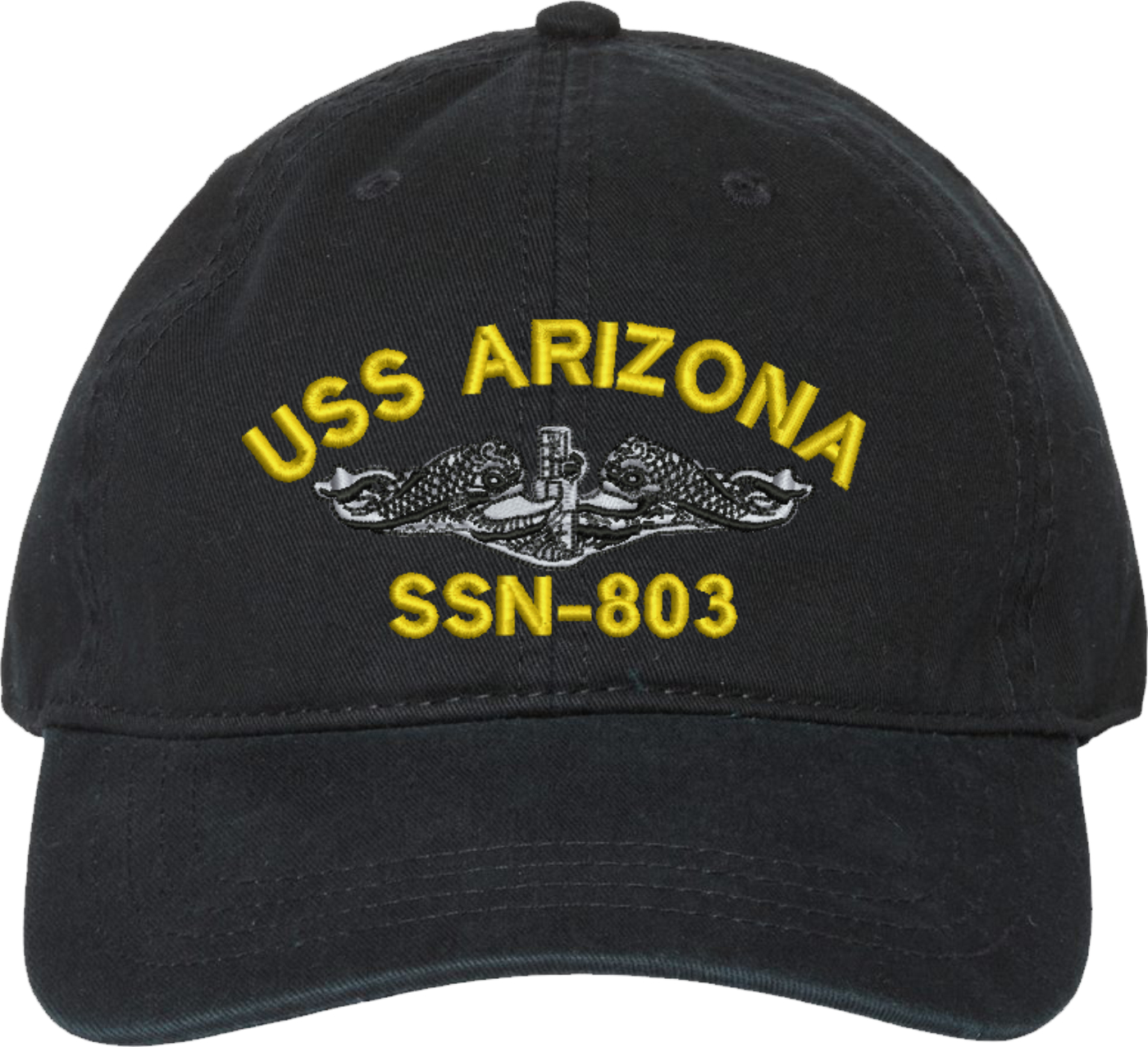 Show your Navy pride with this USS Arizona SSN-803 with Dolphins Unstructured Dad Cap from MilitaryBest. Crafted from 100% washed chino twill cotton, this six-panel, low-profile cap offers a relaxed and comfortable fit. Featuring high-quality embroidery done in our Scottsboro, Alabama facility, this cap is designed with a pre-curved visor and an adjustable tri-glide buckle closure for a perfect fit. Whether for everyday wear or as a meaningful gift, this cap is a great way to honor your own or a loved one's service.For caps ordered with custom embroidered personalized text please allow an additional 3 to 5 days production time. All custom back text will be embroidered in ALL CAPITAL LETTERS. Caps with back text or eggs are non-returnable unless there is a material defect in the cap.