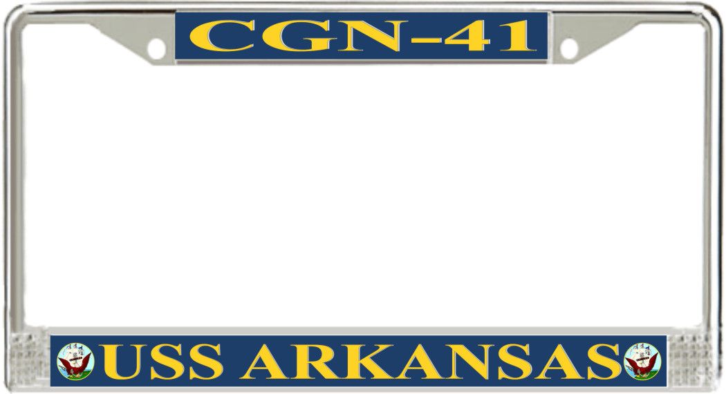 USS Arkansas CGN-41 License Plate FrameThis USS Arkansas CGN-41 License Plate Frame is proudly made in the USA at our facilities in Scottsboro, Alabama. Each of our MilitaryBest U.S. Navy Frames feature top and bottom Poly Coated Aluminum strips that are printed using sublimation which gives these quality automobile military frames a beautiful high gloss finish.