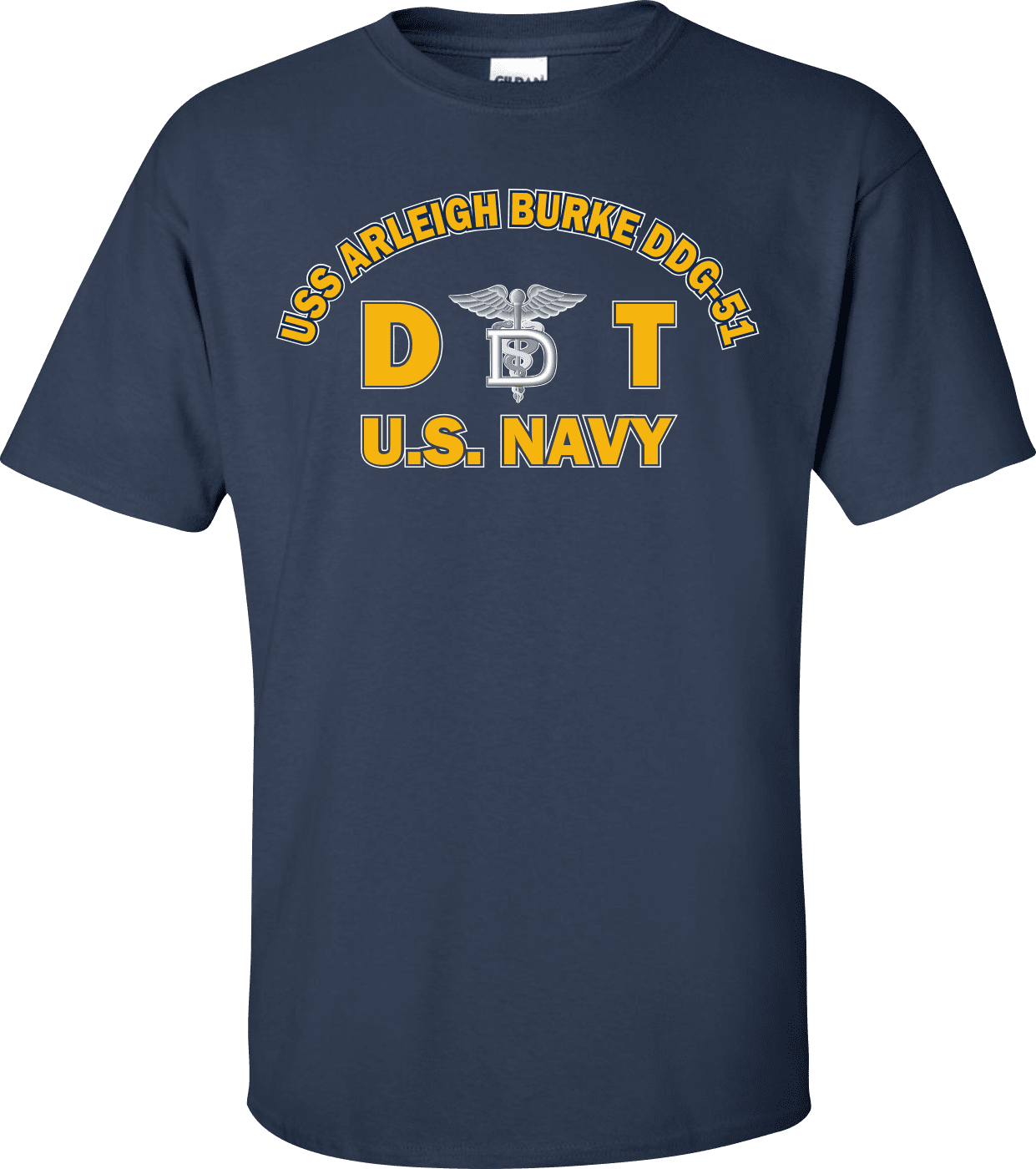 MilitaryBest is proud to offer this USS ARLEIGH BURKE DDG-51 Rate DT Dental Technician T-Shirt. This shirt is available as a 100% cotton t-shirt or a 100% polyester men’s or women’s moisture wicking t-shirt. Each shirt is proudly printed in the USA.
