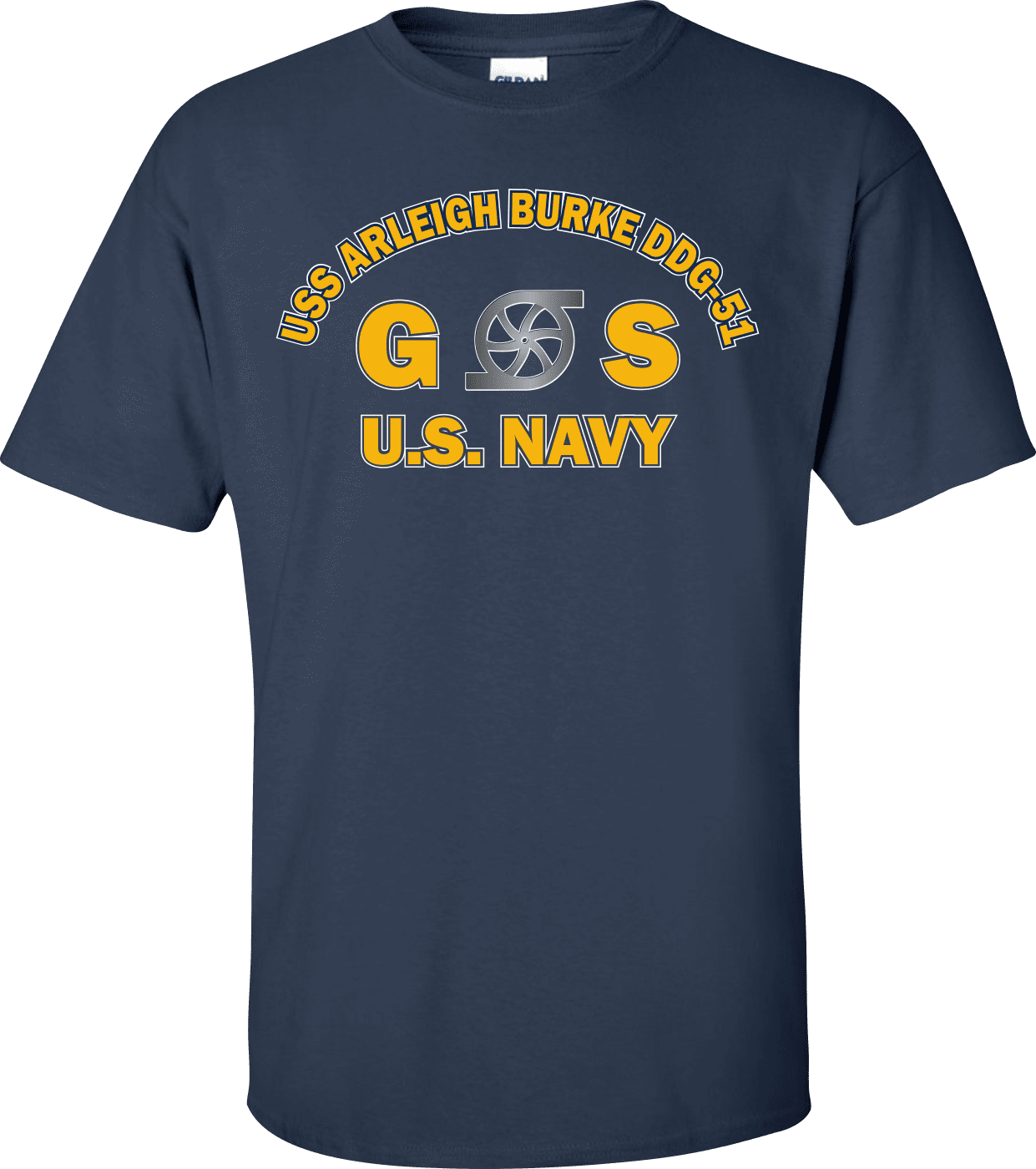 MilitaryBest is proud to offer this USS ARLEIGH BURKE DDG-51 Rate GS Gas Turbine System Technician T-Shirt. This shirt is available as a 100% cotton t-shirt or a 100% polyester men’s or women’s moisture wicking t-shirt. Each shirt is proudly printed in the USA.