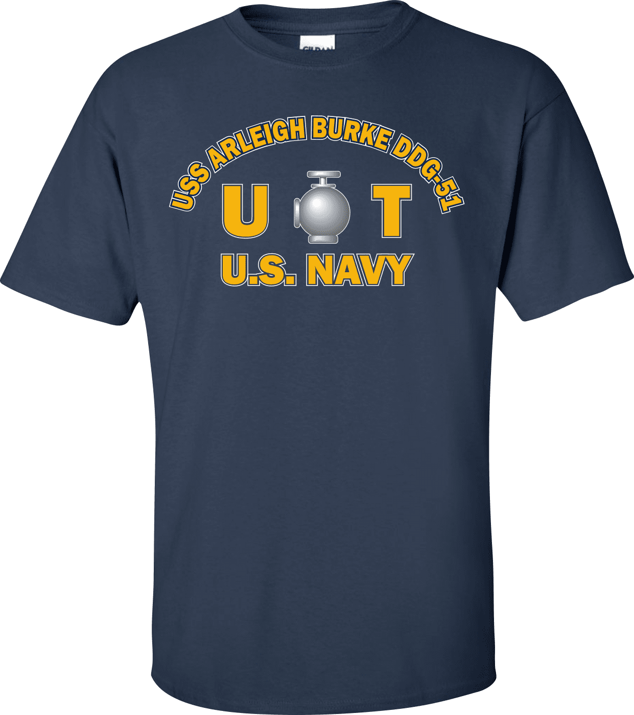 MilitaryBest is proud to offer this USS ARLEIGH BURKE DDG-51 Rate UT Utilitiesman T-Shirt. This shirt is available as a 100% cotton t-shirt or a 100% polyester men’s or women’s moisture wicking t-shirt. Each shirt is proudly printed in the USA.