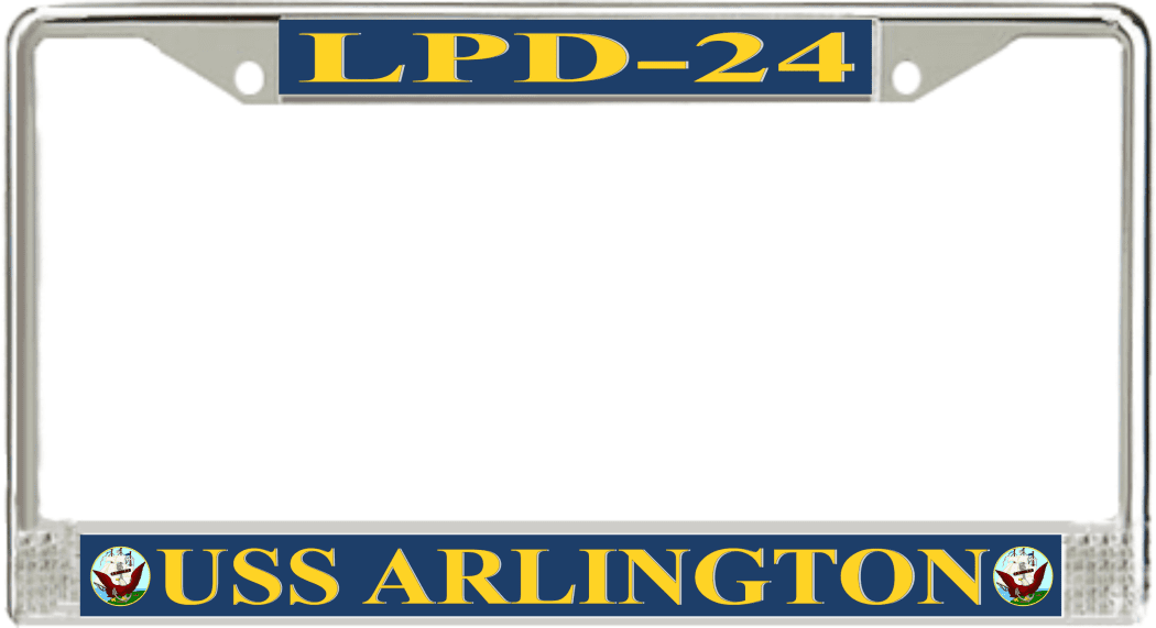 USS Arlington LPD-24 License Plate FrameThis USS Arlington LPD-24 License Plate Frame is proudly made in the USA at our facilities in Scottsboro, Alabama. Each of our MilitaryBest U.S. Navy Frames feature top and bottom Poly Coated Aluminum strips that are printed using sublimation which gives these quality automobile military frames a beautiful high gloss finish.