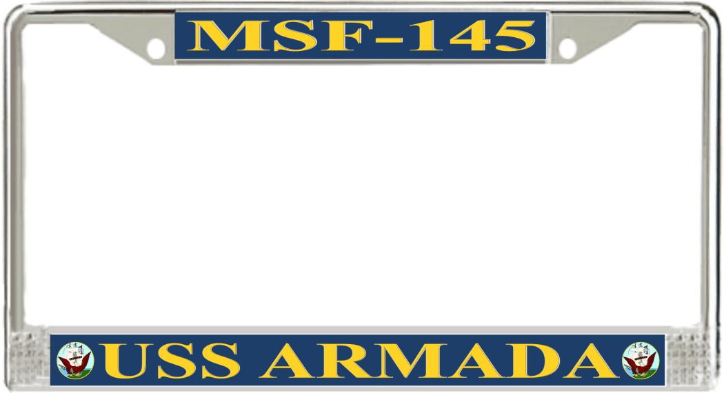 USS Armada MSF-145 License Plate FrameThis USS Armada MSF-145 License Plate Frame is proudly made in the USA at our facilities in Scottsboro, Alabama. Each of our MilitaryBest U.S. Navy Frames feature top and bottom Poly Coated Aluminum strips that are printed using sublimation which gives these quality automobile military frames a beautiful high gloss finish.