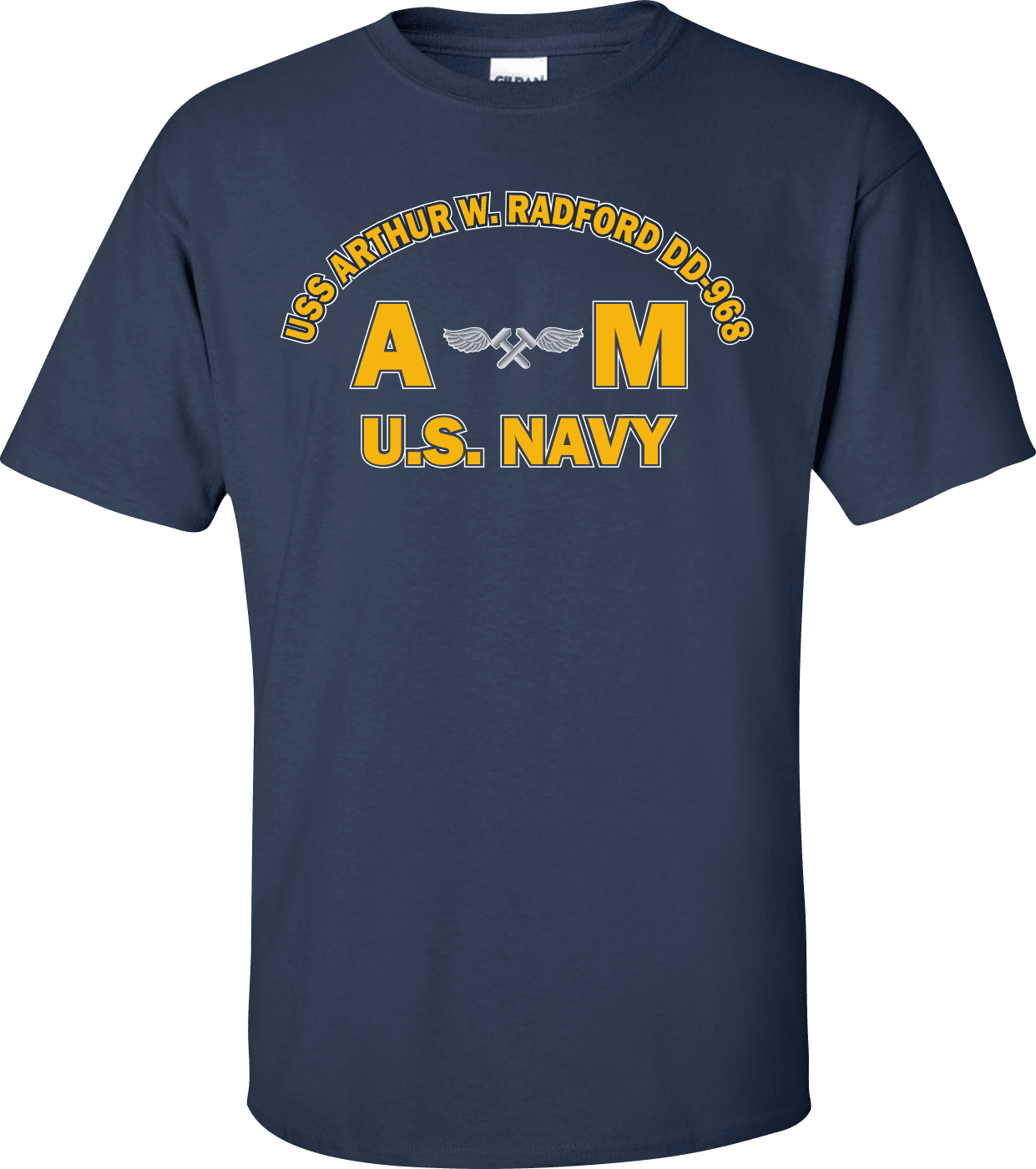MilitaryBest is proud to offer this USS ARTHUR W. RADFORD DD-968 Rate AM Aviation Structural Mechanic T-Shirt. This shirt is available as a 100% cotton t-shirt or a 100% polyester men’s or women’s moisture wicking t-shirt. Each shirt is proudly printed in the USA.