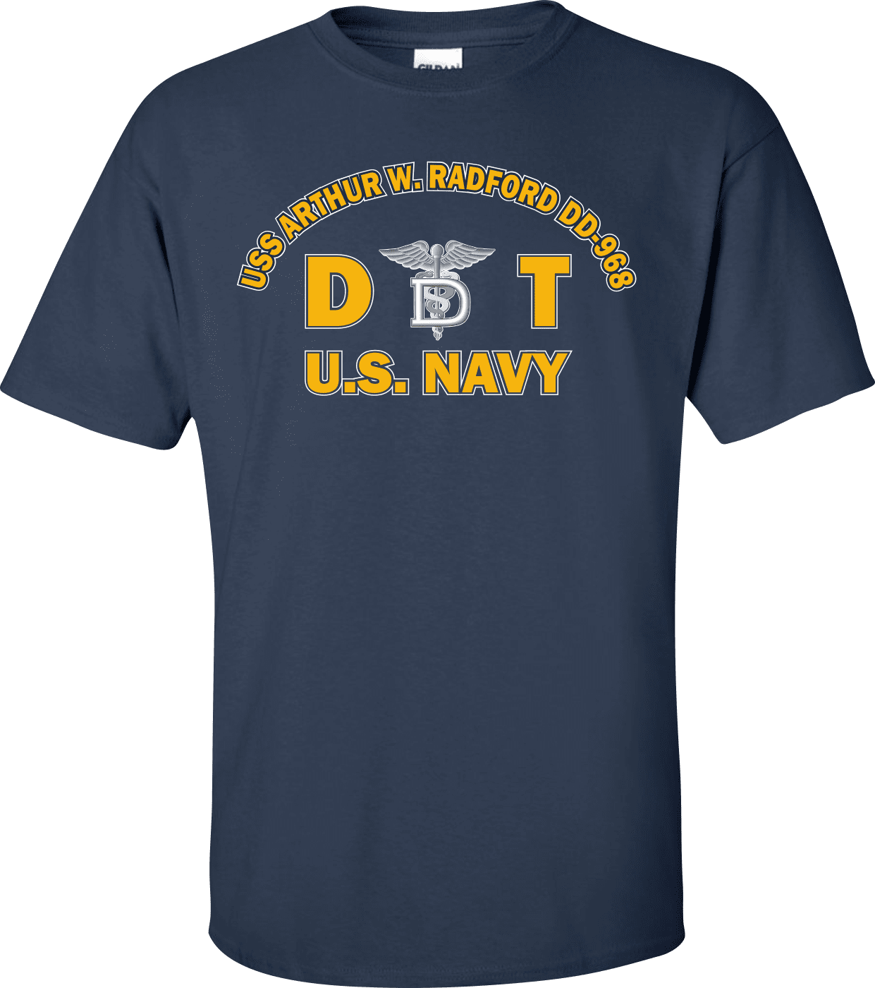MilitaryBest is proud to offer this USS ARTHUR W. RADFORD DD-968 Rate DT Dental Technician T-Shirt. This shirt is available as a 100% cotton t-shirt or a 100% polyester men’s or women’s moisture wicking t-shirt. Each shirt is proudly printed in the USA.