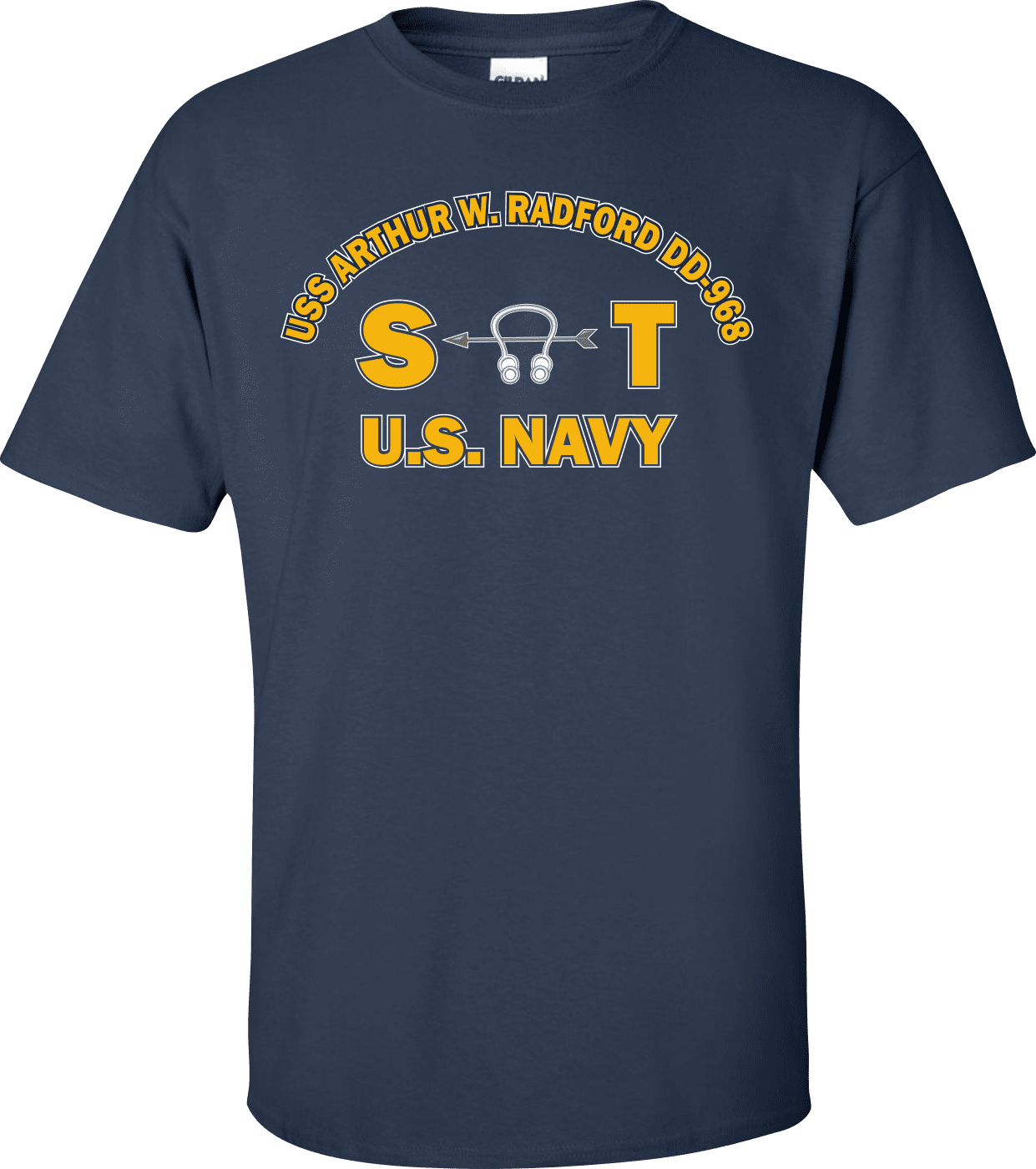MilitaryBest is proud to offer this USS ARTHUR W. RADFORD DD-968 Rate ST Sonar Technician T-Shirt. This shirt is available as a 100% cotton t-shirt or a 100% polyester men’s or women’s moisture wicking t-shirt. Each shirt is proudly printed in the USA.