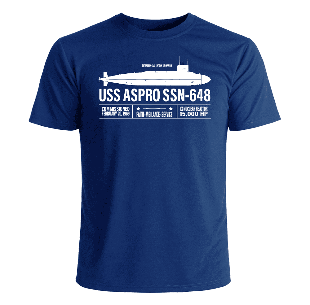 MilitaryBest is proud to offer this U.S. Navy Submarine T-Shirt. Each design is offered in Navy Blue. This fine USS Aspro SSN-648 T-Shirt is proudly printed in the USA. The quality of all of our Military products is guaranteed. Unless there is a defect in workmanship or material, these shirts are unreturnable.A percentage of the sale of each MilitaryBest item is forwarded to the licensing departments of each respective branch of service in support of the MWR (Morale, Welfare, & Recreation) program. These payments are made by either ALL4U LLC or the wholesaler from where the item originated. Our team thanks you for your service and your support of these programs.
