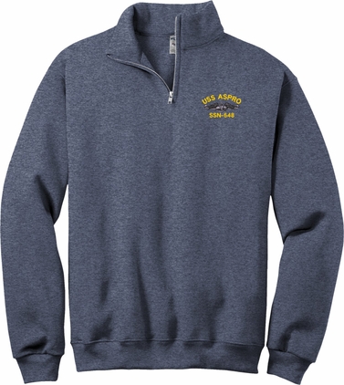 MilitaryBest is proud to offer this USS Aspro SSN-648 with Dolphins Embroidered Quarter-Zip Pullover. This quality shirt is embroidered by our MilitaryBest team in Northeast Alabama.PRODUCT FEATURES