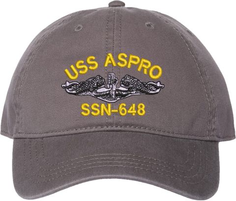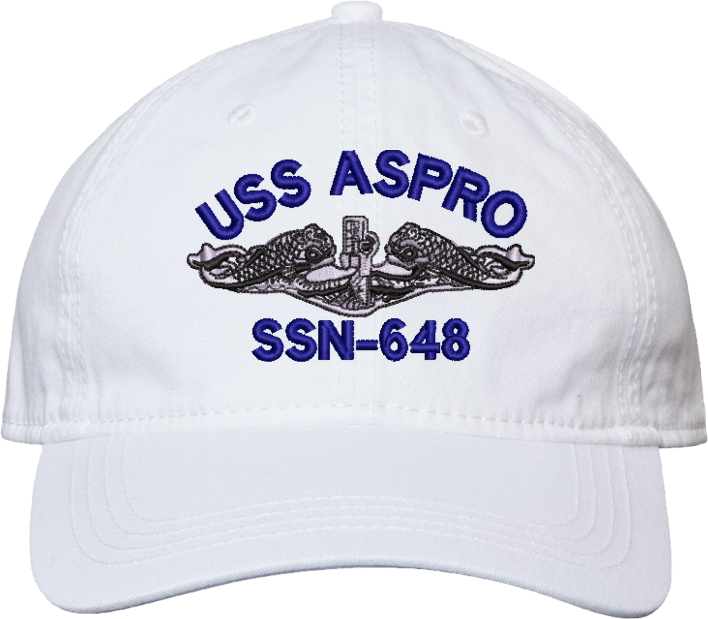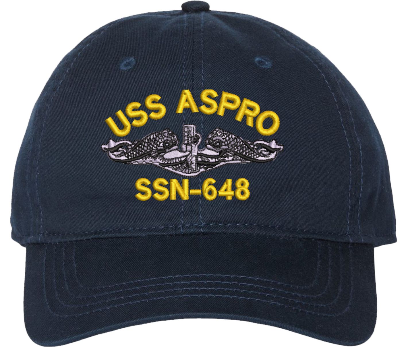 Show your Navy pride with this USS Aspro SSN-648 with Dolphins Unstructured Dad Cap from MilitaryBest. Crafted from 100% washed chino twill cotton, this six-panel, low-profile cap offers a relaxed and comfortable fit. Featuring high-quality embroidery done in our Scottsboro, Alabama facility, this cap is designed with a pre-curved visor and an adjustable tri-glide buckle closure for a perfect fit. Whether for everyday wear or as a meaningful gift, this cap is a great way to honor your own or a loved one's service.For caps ordered with custom embroidered personalized text please allow an additional 3 to 5 days production time. All custom back text will be embroidered in ALL CAPITAL LETTERS. Caps with back text or eggs are non-returnable unless there is a material defect in the cap.