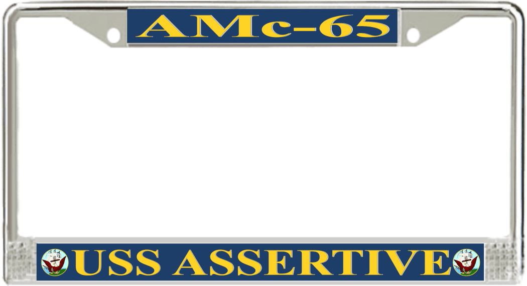 USS Assertive AMc-65 License Plate FrameThis USS Assertive AMc-65 License Plate Frame is proudly made in the USA at our facilities in Scottsboro, Alabama. Each of our MilitaryBest U.S. Navy Frames feature top and bottom Poly Coated Aluminum strips that are printed using sublimation which gives these quality automobile military frames a beautiful high gloss finish.