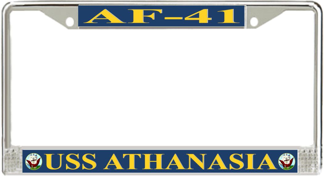 USS Athanasia AF-41 License Plate FrameThis USS Athanasia AF-41 License Plate Frame is proudly made in the USA at our facilities in Scottsboro, Alabama. Each of our MilitaryBest U.S. Navy Frames feature top and bottom Poly Coated Aluminum strips that are printed using sublimation which gives these quality automobile military frames a beautiful high gloss finish.