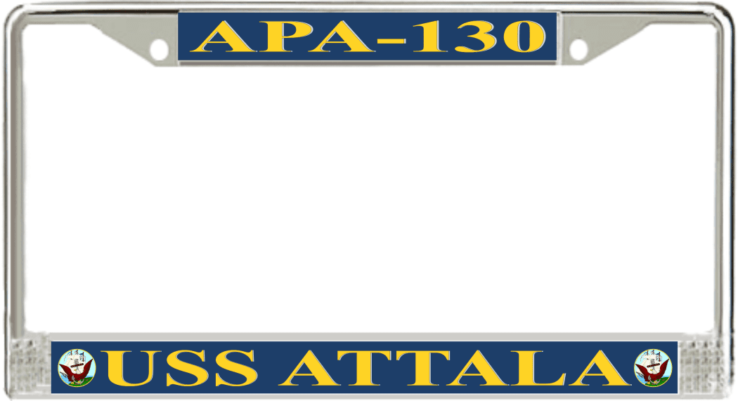 USS Attala APA-130 License Plate FrameThis USS Attala APA-130 License Plate Frame is proudly made in the USA at our facilities in Scottsboro, Alabama. Each of our MilitaryBest U.S. Navy Frames feature top and bottom Poly Coated Aluminum strips that are printed using sublimation which gives these quality automobile military frames a beautiful high gloss finish.