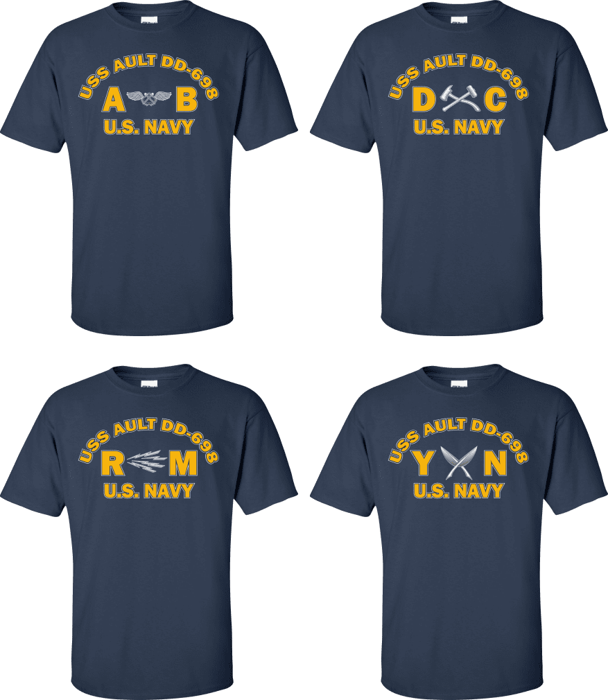 Due to disruptions in supply chains, this design will be embroidered on a Champion, Gildan, Jerzees or comparable brand.Proudly display your ship and rate with our top quality USS AULT DD-698 Rates t-shirts, sweatshirts, and hoodies. These fine U.S. Navy apparel items will make you the envy of your veteran buddies, or will make a fine gift! Our USS AULT DD-698 shirts are proudly printed in the USA!