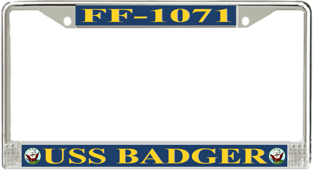 USS Badger FF-1071 License Plate FrameThis USS Badger FF-1071 License Plate Frame is proudly made in the USA at our facilities in Scottsboro, Alabama. Each of our MilitaryBest U.S. Navy Frames feature top and bottom Poly Coated Aluminum strips that are printed using sublimation which gives these quality automobile military frames a beautiful high gloss finish.