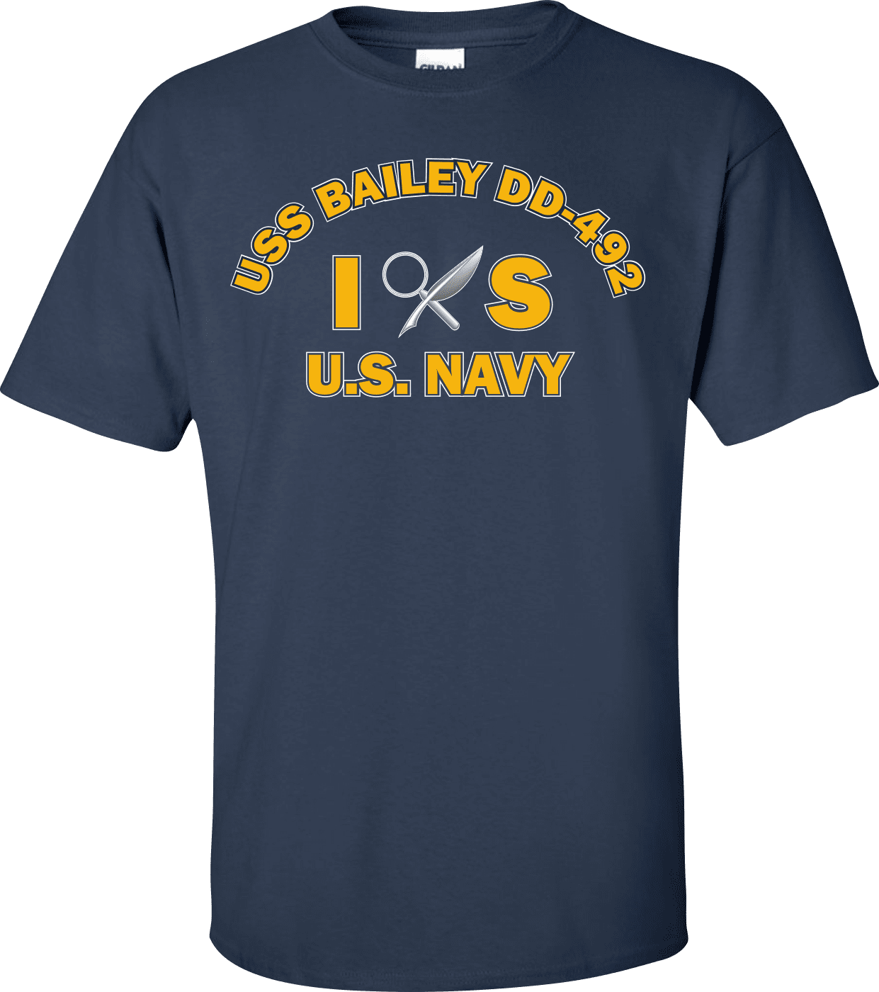 MilitaryBest is proud to offer this USS BAILEY DD-492 Rate IS Intelligence Specialist T-Shirt. This shirt is available as a 100% cotton t-shirt or a 100% polyester men’s or women’s moisture wicking t-shirt. Each shirt is proudly printed in the USA.