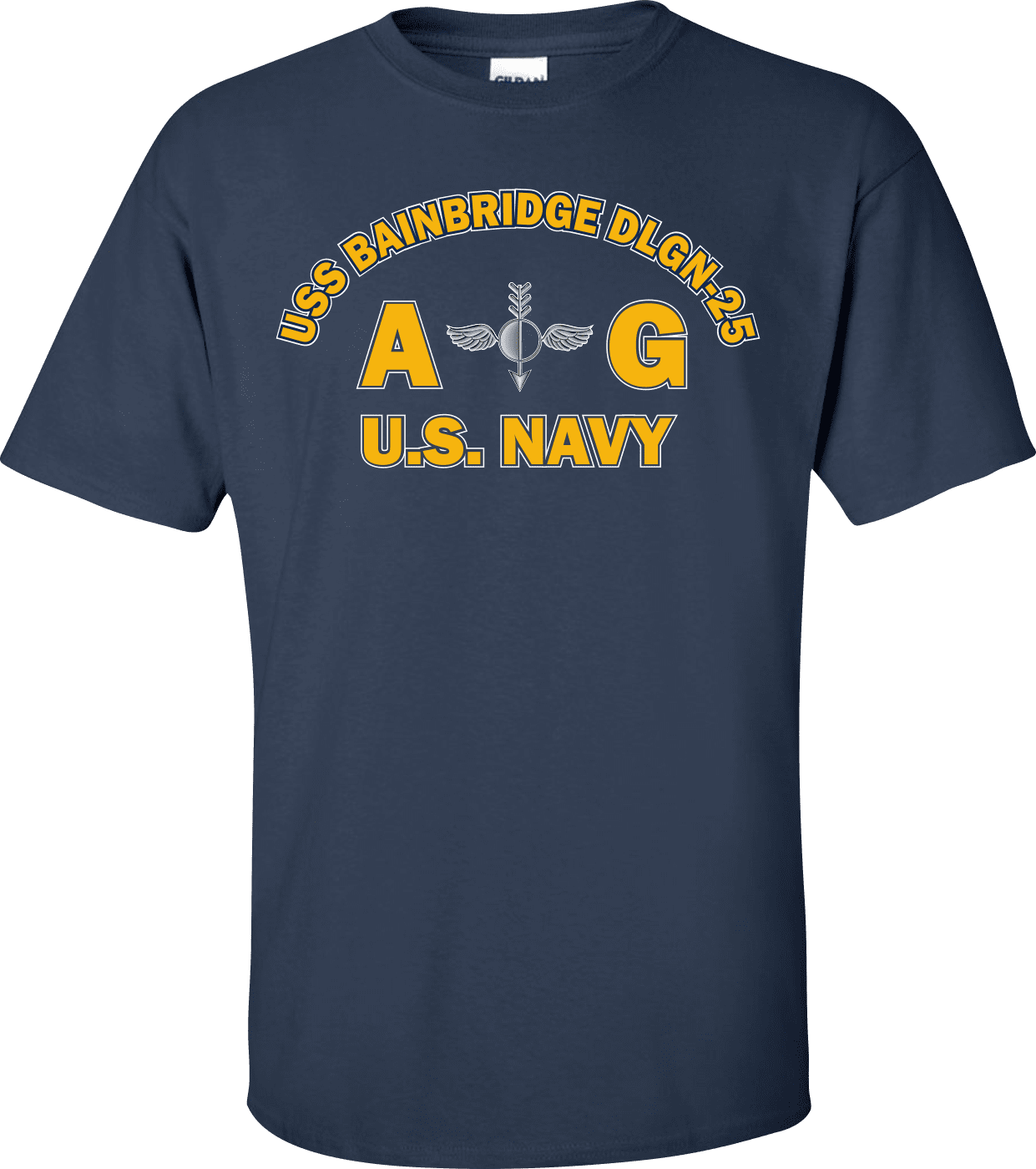 MilitaryBest is proud to offer this USS BAINBRIDGE DLGN-25 Rate AG Aerographers Mate T-Shirt. This shirt is available as a 100% cotton t-shirt or a 100% polyester men’s or women’s moisture wicking t-shirt. Each shirt is proudly printed in the USA.