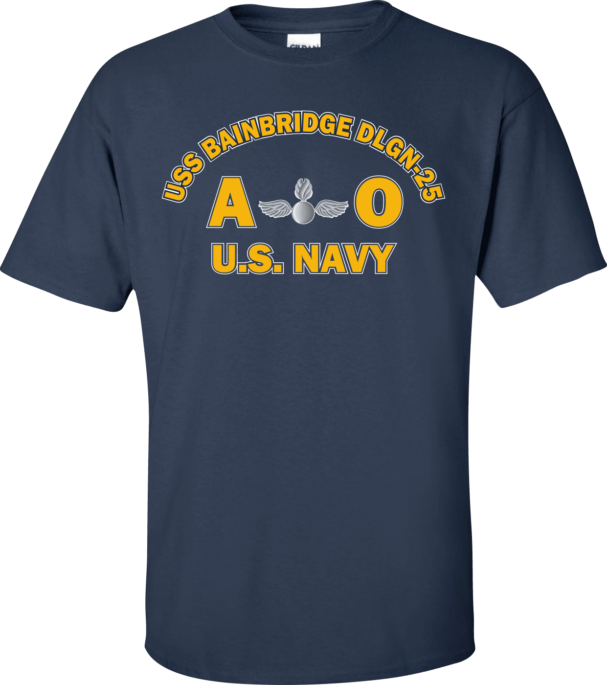 MilitaryBest is proud to offer this USS BAINBRIDGE DLGN-25 Rate AO Aviation Ordnanceman T-Shirt. This shirt is available as a 100% cotton t-shirt or a 100% polyester men’s or women’s moisture wicking t-shirt. Each shirt is proudly printed in the USA.