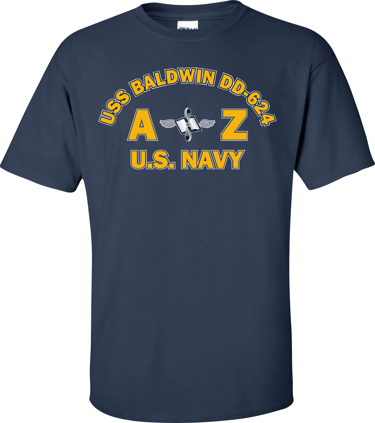 MilitaryBest is proud to offer this USS BALDWIN DD-624 Rate AZ Aviation Maintenance Administrationman T-Shirt. This shirt is available as a 100% cotton t-shirt or a 100% polyester men’s or women’s moisture wicking t-shirt. Each shirt is proudly printed in the USA.