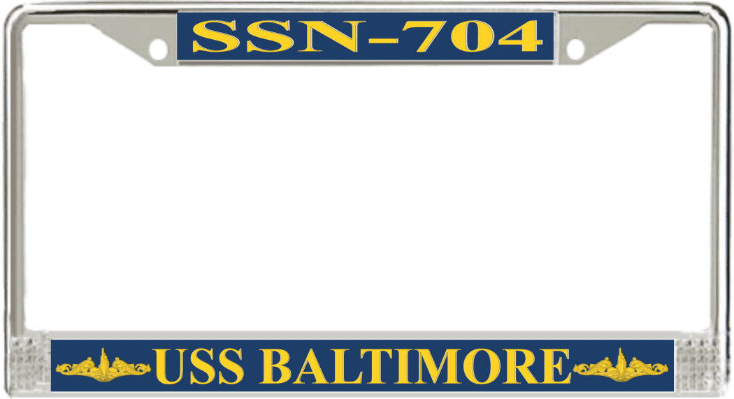 USS Baltimore SSN-704 License Plate Frame This USS Baltimore SSN-704 License Plate Frame is proudly made in the USA at our facilities in Scottsboro, Alabama. Each Frame features top and bottom sublimated design strips that are poly coated for a protective gloss finish. Please check your state and local regulations for compatibility of these frames for use on your vehicle.