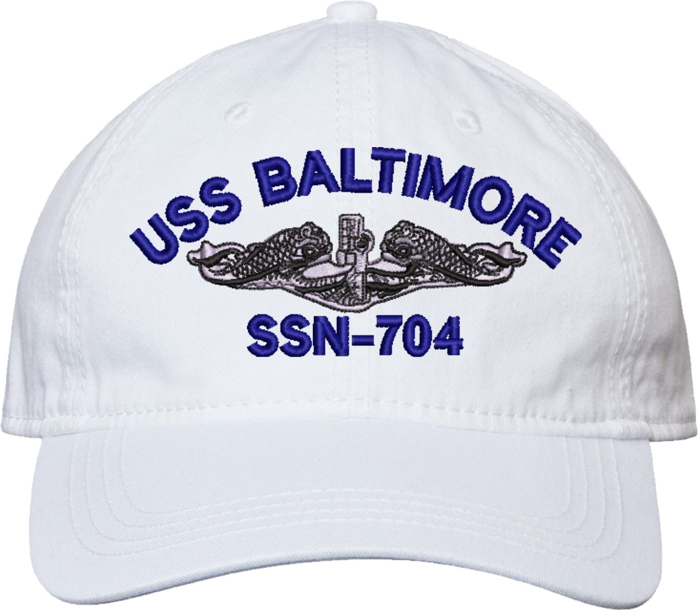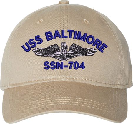 Show your Navy pride with this USS Baltimore SSN-704 with Dolphins Unstructured Dad Cap from MilitaryBest. Crafted from 100% washed chino twill cotton, this six-panel, low-profile cap offers a relaxed and comfortable fit. Featuring high-quality embroidery done in our Scottsboro, Alabama facility, this cap is designed with a pre-curved visor and an adjustable tri-glide buckle closure for a perfect fit. Whether for everyday wear or as a meaningful gift, this cap is a great way to honor your own or a loved one's service.For caps ordered with custom embroidered personalized text please allow an additional 3 to 5 days production time. All custom back text will be embroidered in ALL CAPITAL LETTERS. Caps with back text or eggs are non-returnable unless there is a material defect in the cap.