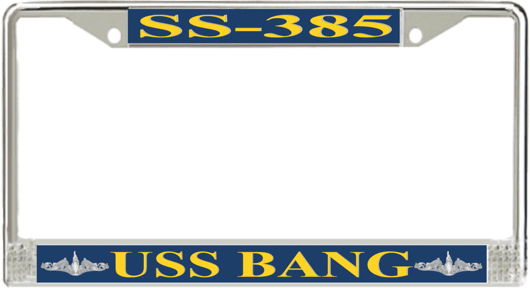 USS Bang SS-385 License Plate Frame This USS Bang SS-385 License Plate Frame is proudly made in the USA at our facilities in Scottsboro, Alabama. Each Frame features top and bottom sublimated design strips that are poly coated for a protective gloss finish. Please check your state and local regulations for compatibility of these frames for use on your vehicle.