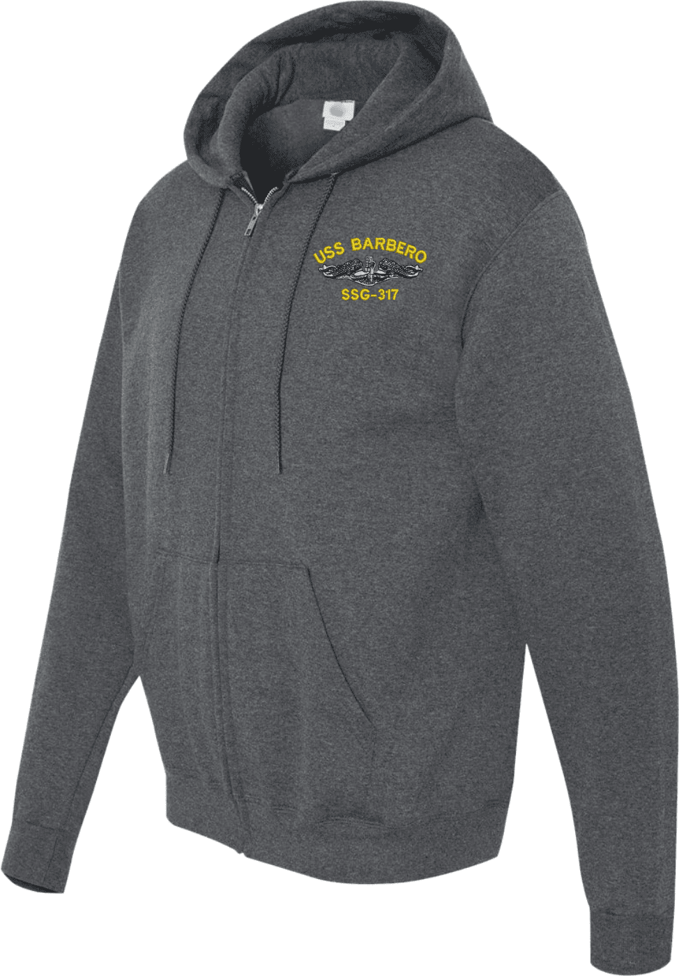 MilitaryBest has expanded its line of apparel with this custom embroidered USS Barb SSN-596 with Dolphins Embroidered Zippered Hoodie. Each Hoodie is direct embroidered onto a Champion brand 9.5 oz 50/50 Cotton Poly blend. This will make an excellent addition to your wardrobe, or a great gift. Your satisfaction is Guaranteed! These quality zippered hoodies are proudly embroidered at our facilities in Scottsboro, AL. Support the Army MWR program by purchasing only from Licensed Vendors.