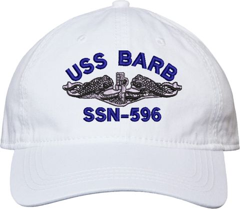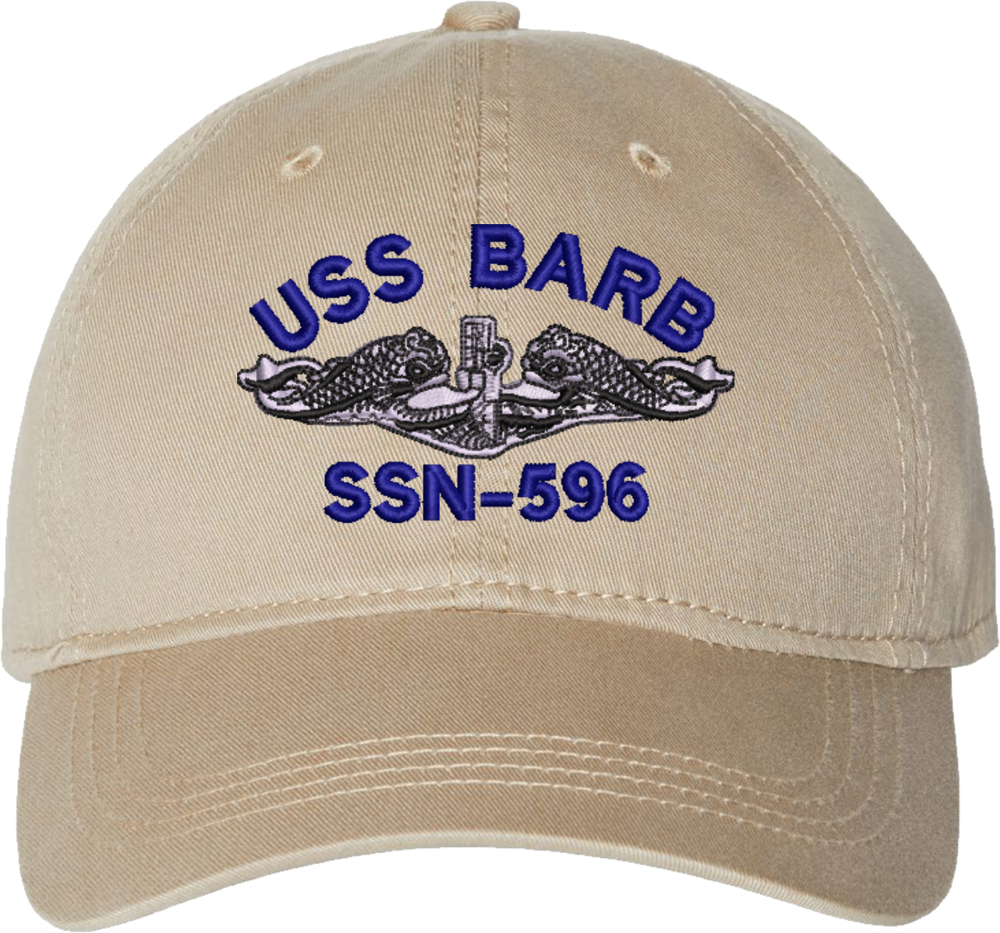Show your Navy pride with this USS Barb SSN-596 with Dolphins Unstructured Dad Cap from MilitaryBest. Crafted from 100% washed chino twill cotton, this six-panel, low-profile cap offers a relaxed and comfortable fit. Featuring high-quality embroidery done in our Scottsboro, Alabama facility, this cap is designed with a pre-curved visor and an adjustable tri-glide buckle closure for a perfect fit. Whether for everyday wear or as a meaningful gift, this cap is a great way to honor your own or a loved one's service.For caps ordered with custom embroidered personalized text please allow an additional 3 to 5 days production time. All custom back text will be embroidered in ALL CAPITAL LETTERS. Caps with back text or eggs are non-returnable unless there is a material defect in the cap.