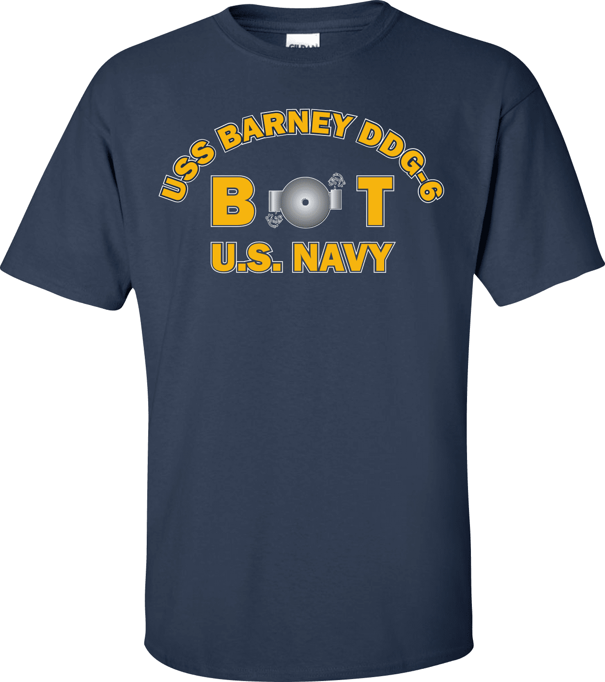 MilitaryBest is proud to offer this USS BARNEY DDG-6 Rate BT Boiler Technician T-Shirt. This shirt is available as a 100% cotton t-shirt or a 100% polyester men’s or women’s moisture wicking t-shirt. Each shirt is proudly printed in the USA.