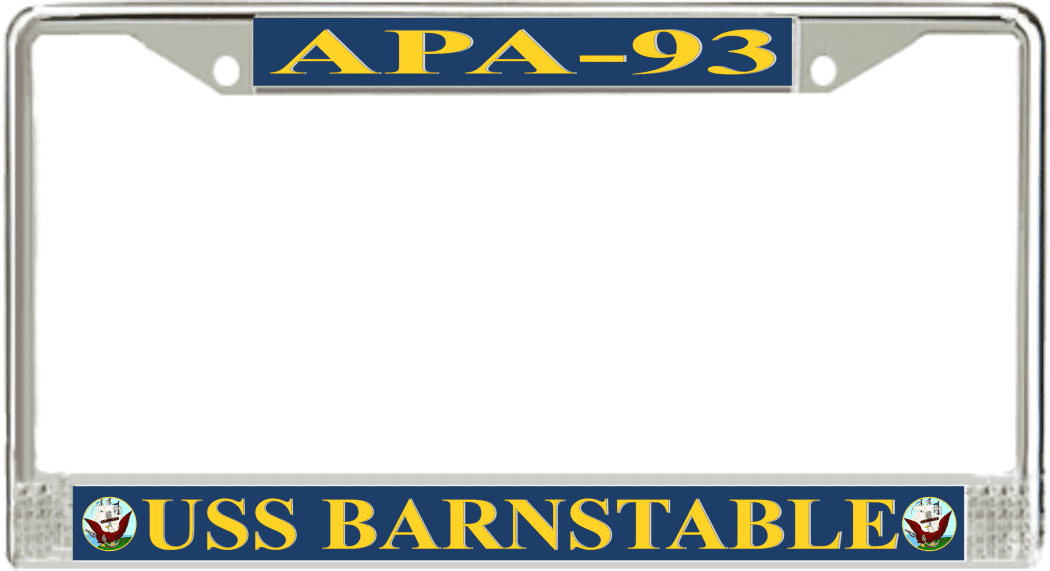 USS Barnstable APA-93 License Plate FrameThis USS Barnstable APA-93 License Plate Frame is proudly made in the USA at our facilities in Scottsboro, Alabama. Each of our MilitaryBest U.S. Navy Frames feature top and bottom Poly Coated Aluminum strips that are printed using sublimation which gives these quality automobile military frames a beautiful high gloss finish.