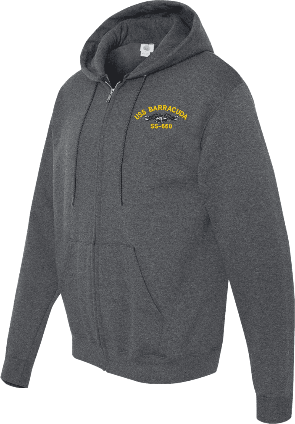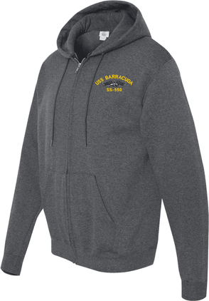 MilitaryBest has expanded its line of apparel with this custom embroidered USS Barracuda SS-550 with Dolphins Embroidered Zippered Hoodie. Each Hoodie is direct embroidered onto a Champion brand 9.5 oz 50/50 Cotton Poly blend. This will make an excellent addition to your wardrobe, or a great gift. Your satisfaction is Guaranteed! These quality zippered hoodies are proudly embroidered at our facilities in Scottsboro, AL. Support the Army MWR program by purchasing only from Licensed Vendors.