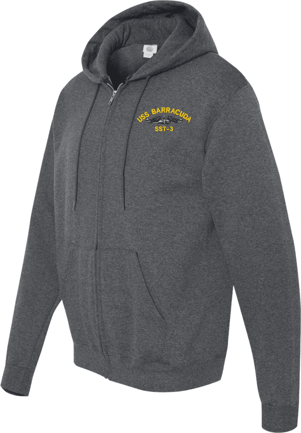 MilitaryBest has expanded its line of apparel with this custom embroidered USS Barracuda SST-3 with Dolphins Embroidered Zippered Hoodie. Each Hoodie is direct embroidered onto a Champion brand 9.5 oz 50/50 Cotton Poly blend. This will make an excellent addition to your wardrobe, or a great gift. Your satisfaction is Guaranteed! These quality zippered hoodies are proudly embroidered at our facilities in Scottsboro, AL. Support the Army MWR program by purchasing only from Licensed Vendors.