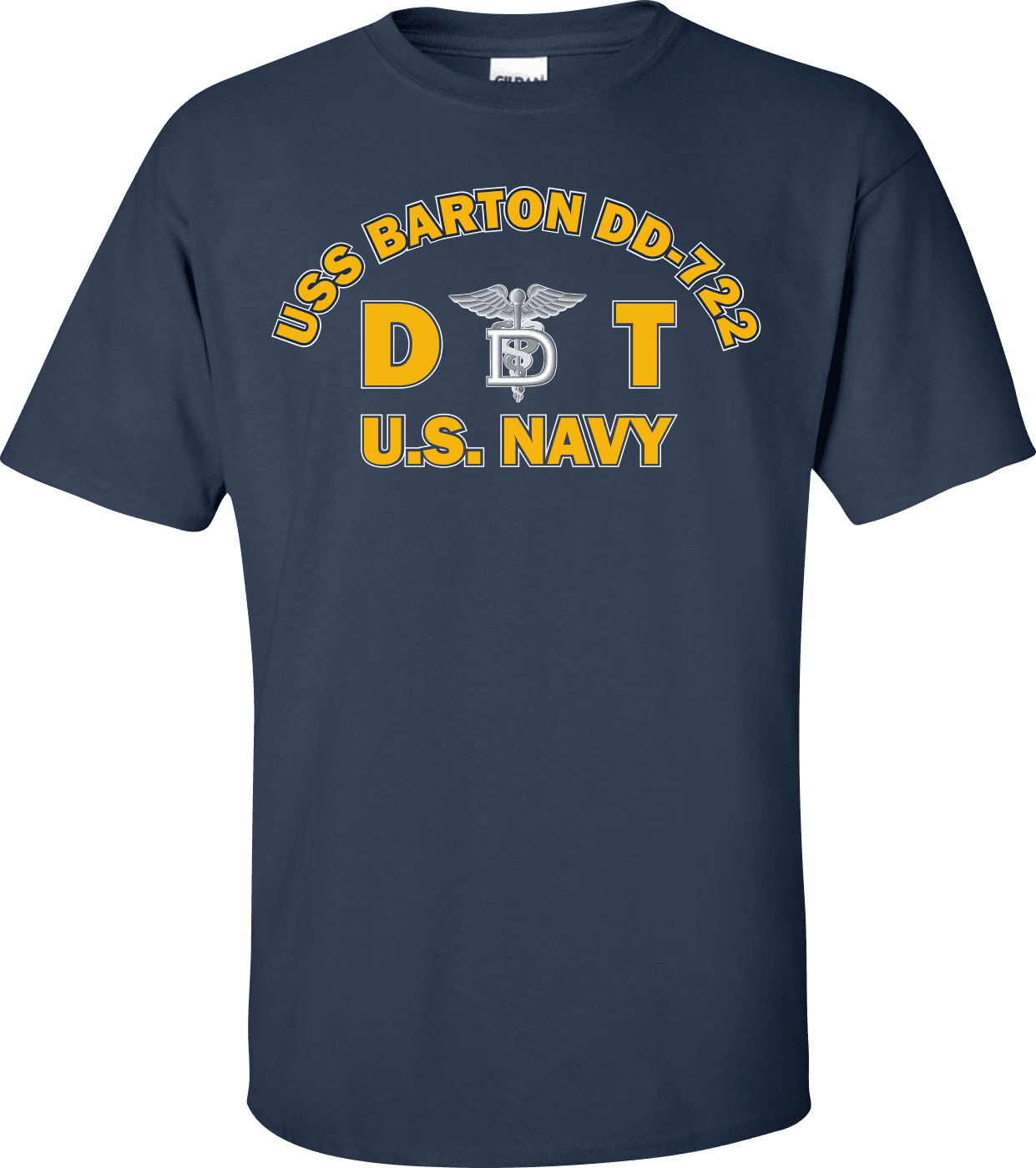 MilitaryBest is proud to offer this USS BARTON DD-722 Rate DT Dental Technician T-Shirt. This shirt is available as a 100% cotton t-shirt or a 100% polyester men’s or women’s moisture wicking t-shirt. Each shirt is proudly printed in the USA.