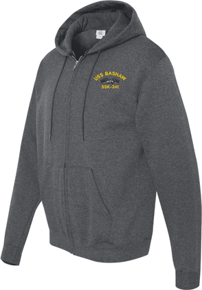 MilitaryBest has expanded its line of apparel with this custom embroidered USS Bashaw SSK-241 with Dolphins Embroidered Zippered Hoodie. Each Hoodie is direct embroidered onto a Champion brand 9.5 oz 50/50 Cotton Poly blend. This will make an excellent addition to your wardrobe, or a great gift. Your satisfaction is Guaranteed! These quality zippered hoodies are proudly embroidered at our facilities in Scottsboro, AL. Support the Army MWR program by purchasing only from Licensed Vendors.