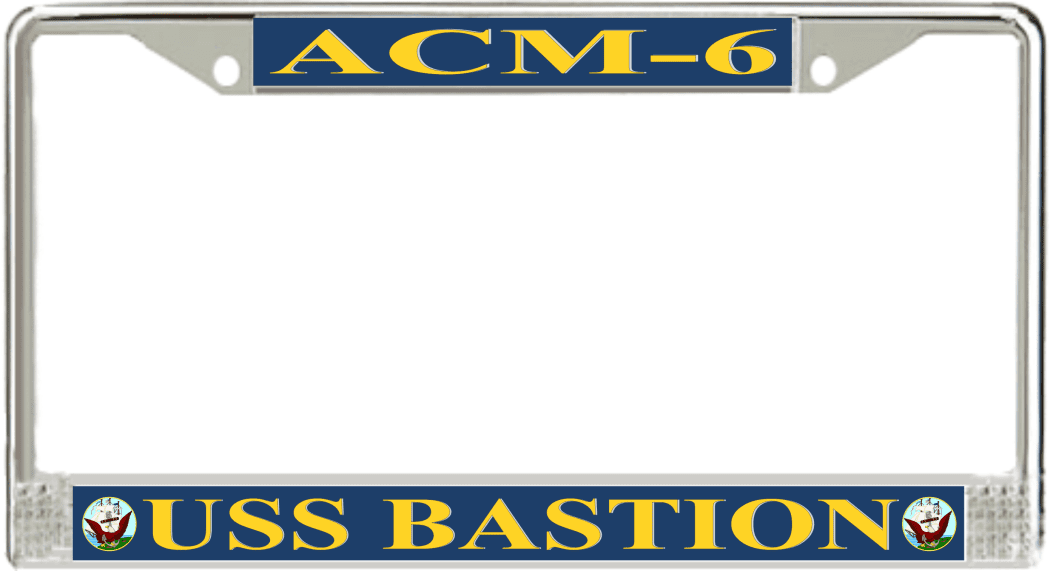 USS Bastion ACM-6 License Plate FrameThis USS Bastion ACM-6 License Plate Frame is proudly made in the USA at our facilities in Scottsboro, Alabama. Each of our MilitaryBest U.S. Navy Frames feature top and bottom Poly Coated Aluminum strips that are printed using sublimation which gives these quality automobile military frames a beautiful high gloss finish.