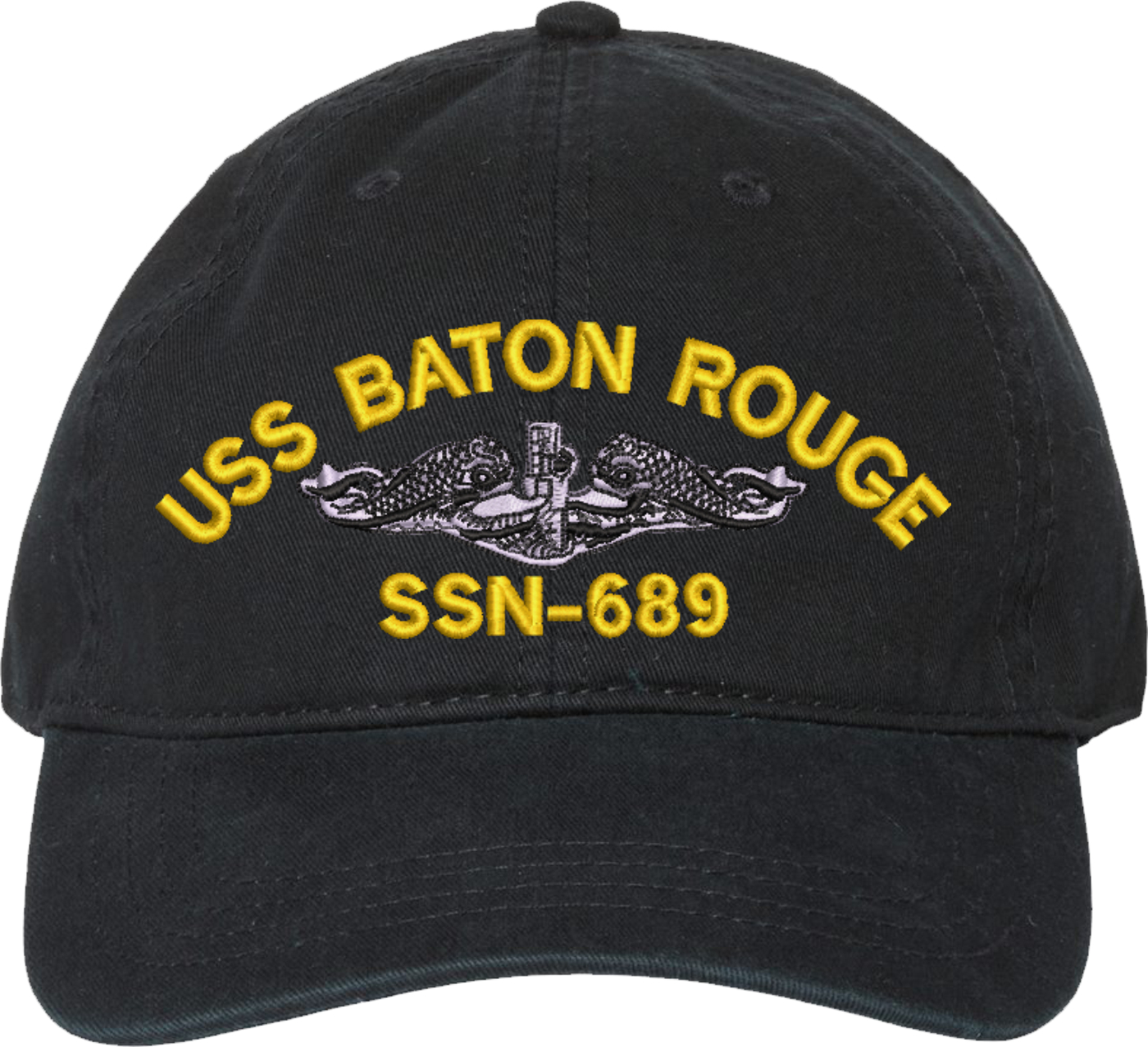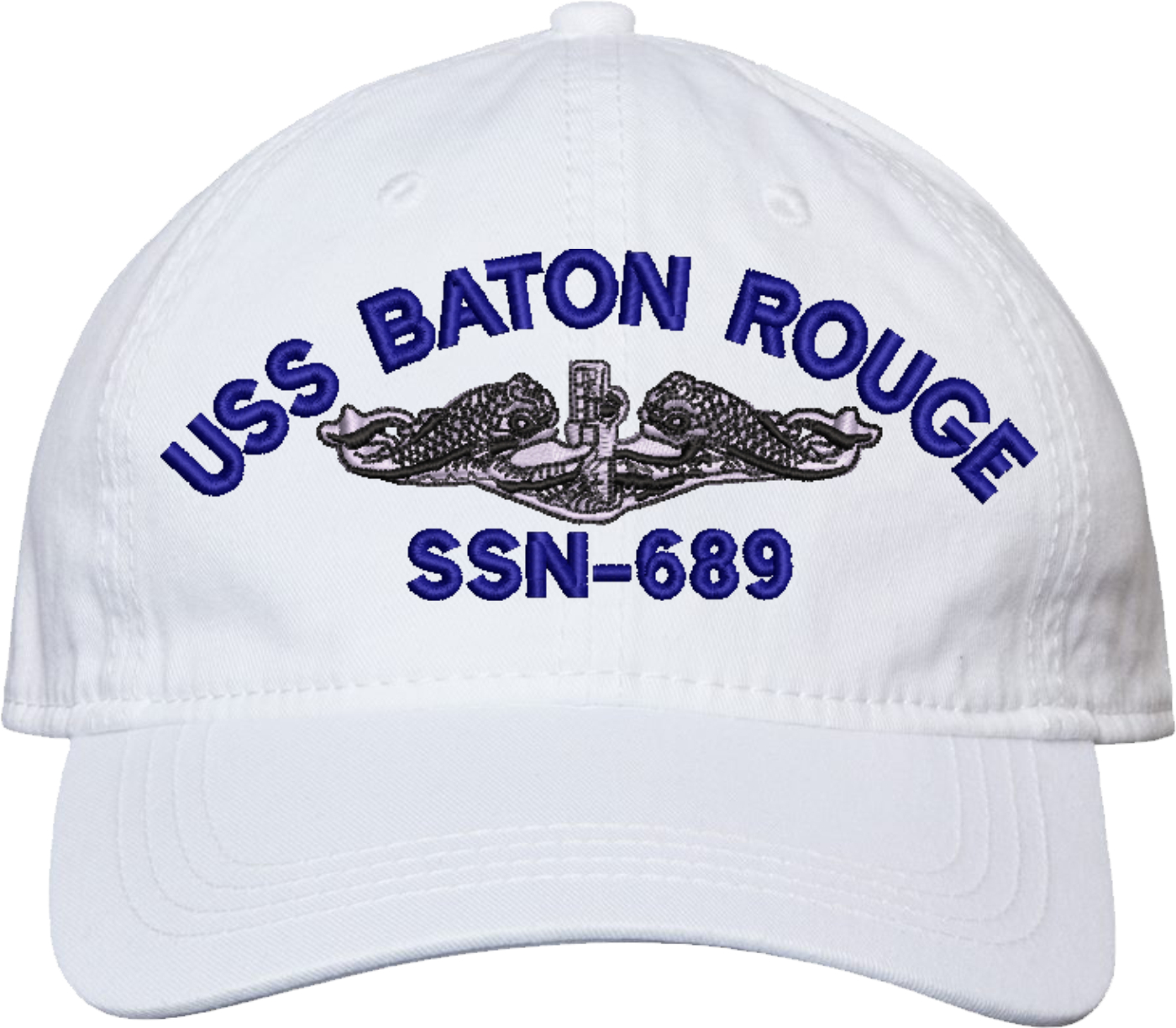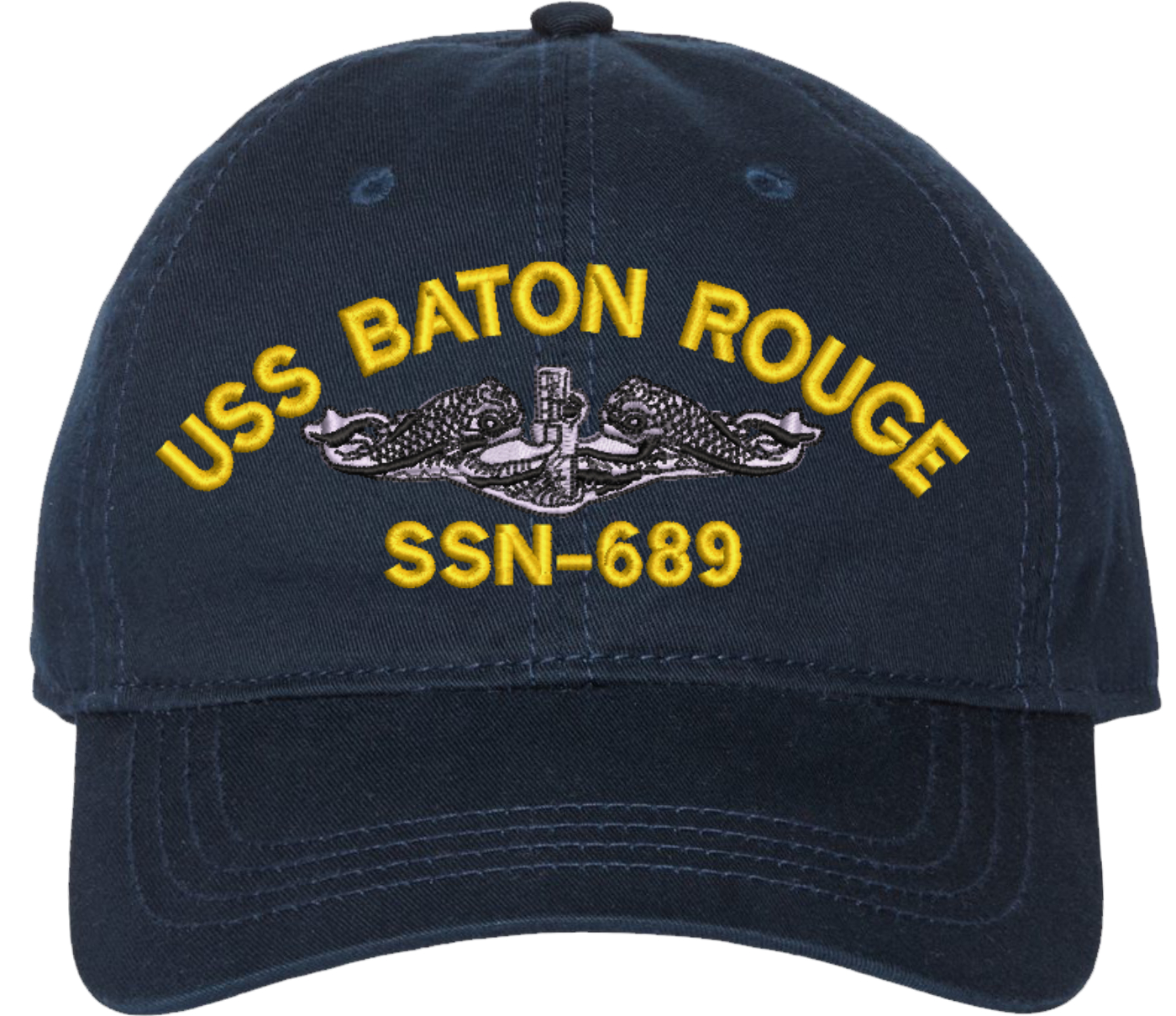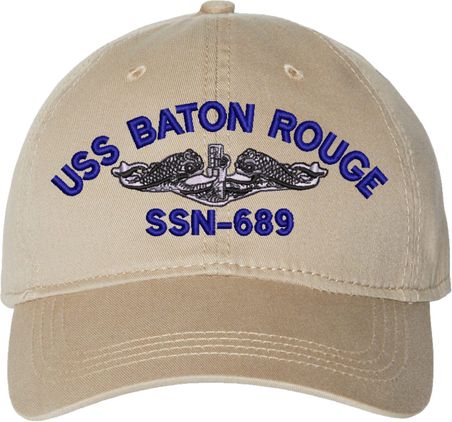 Show your Navy pride with this USS Baton Rouge SSN-689 with Dolphins Unstructured Dad Cap from MilitaryBest. Crafted from 100% washed chino twill cotton, this six-panel, low-profile cap offers a relaxed and comfortable fit. Featuring high-quality embroidery done in our Scottsboro, Alabama facility, this cap is designed with a pre-curved visor and an adjustable tri-glide buckle closure for a perfect fit. Whether for everyday wear or as a meaningful gift, this cap is a great way to honor your own or a loved one's service.For caps ordered with custom embroidered personalized text please allow an additional 3 to 5 days production time. All custom back text will be embroidered in ALL CAPITAL LETTERS. Caps with back text or eggs are non-returnable unless there is a material defect in the cap.