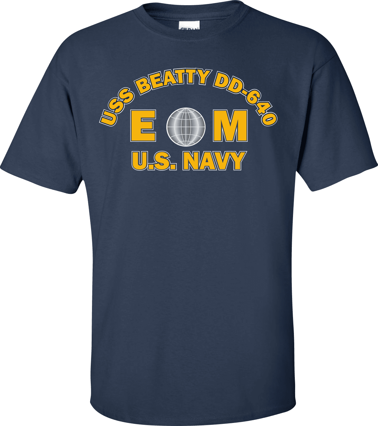 MilitaryBest is proud to offer this USS BEATTY DD-640 Rate EM Electricians Mate T-Shirt. This shirt is available as a 100% cotton t-shirt or a 100% polyester men’s or women’s moisture wicking t-shirt. Each shirt is proudly printed in the USA.