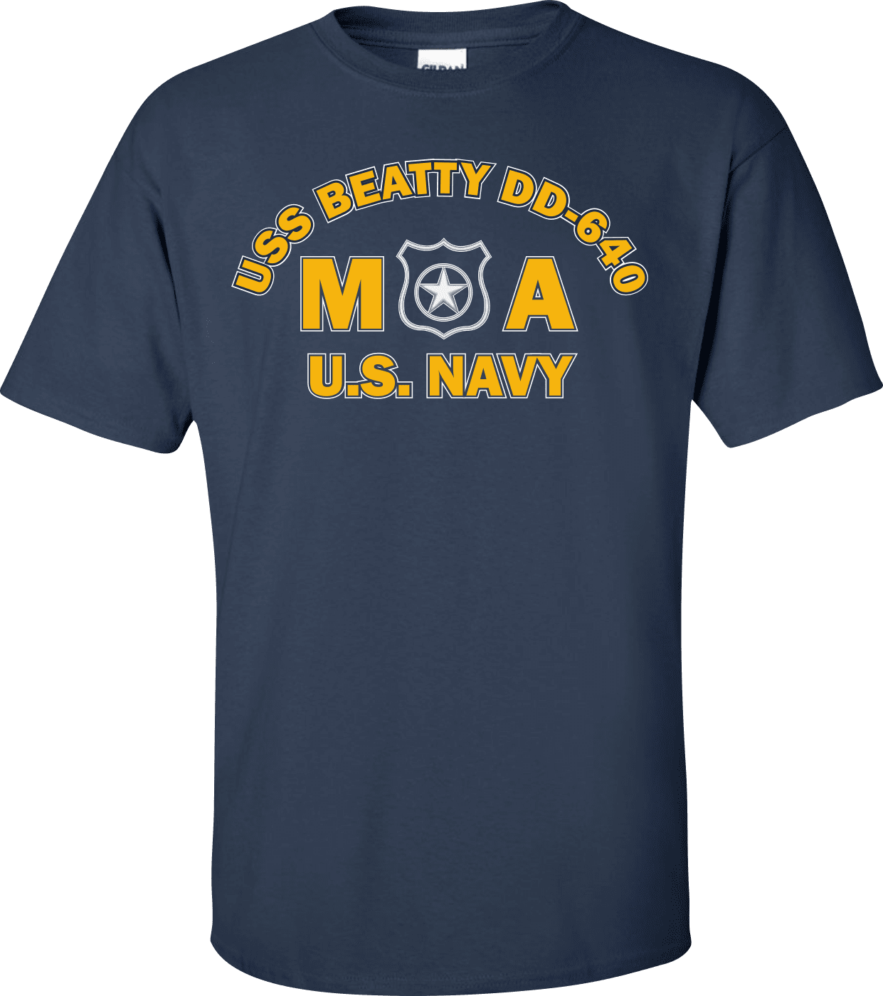 MilitaryBest is proud to offer this USS BEATTY DD-640 Rate MA Master At Arms T-Shirt. This shirt is available as a 100% cotton t-shirt or a 100% polyester men’s or women’s moisture wicking t-shirt. Each shirt is proudly printed in the USA.