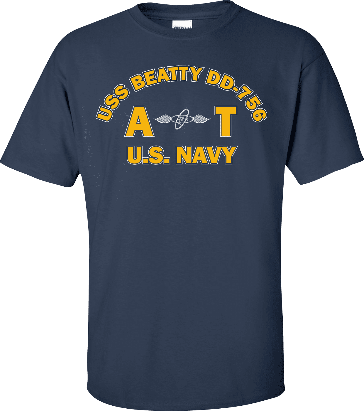 MilitaryBest is proud to offer this USS BEATTY DD-756 Rate AT Aviation Electronics Technician T-Shirt. This shirt is available as a 100% cotton t-shirt or a 100% polyester men’s or women’s moisture wicking t-shirt. Each shirt is proudly printed in the USA.