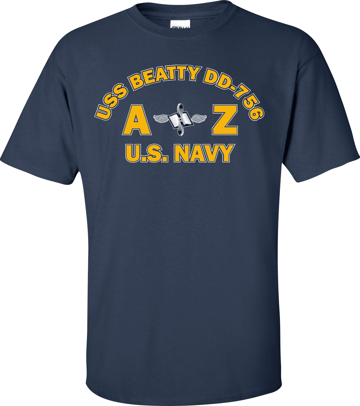 MilitaryBest is proud to offer this USS BEATTY DD-756 Rate AZ Aviation Maintenance Administrationman T-Shirt. This shirt is available as a 100% cotton t-shirt or a 100% polyester men’s or women’s moisture wicking t-shirt. Each shirt is proudly printed in the USA.